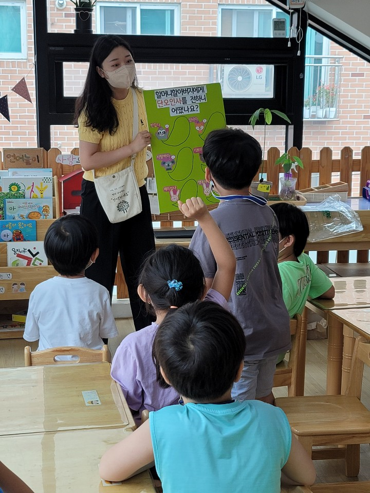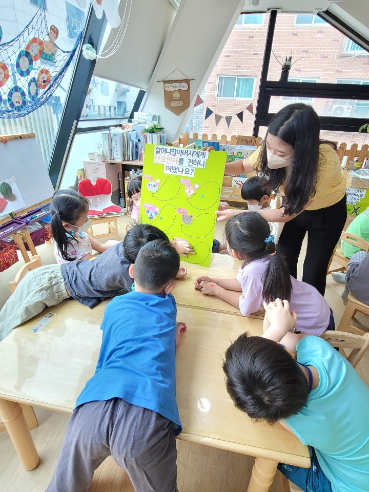 1. 단오 인사캠페인을 준비할 때나 다녀와서 아이들이 해준 말이 있었나요? - 아이들에게는 단옷날이 익숙하지 않아 여러 번 설명해주었지만, 아이들에게 우리가 열심히 만든 부채를 선물로 드린다고 하니 너무 즐거워하는 마음으로 만들었어요. - 부끄럽다는 친구도 있었고 할머니‧할아버지를 만나기를 기대하는 친구도 있었습니다. - 부채를 만든 후 엽서를 쓰면서 “부채로 할머니, 할아버지가 시원하겠지요?”, “건강 하시라고 하고 싶어요.”라고 말했어요. 2. 아이들이 직접 부채를 만들고 엽서를 쓰며 단오캠페인을 진행했는데 어떠셨나요? - 마침 '우리 동네'라는 생활주제로 유아들과 우리 동네에 있는 다양한 기관들과 가게들을 알아보았는데 유아들에게도 지역사회와 연계된 활동을 할 수 있어서 좋았습니다. - 핵가족시대로 지내고 있는 유아들이 할머니‧할아버지를 만나 뵙고 드릴 수 있어서 좋았고, 부채를 만들면서 할머니를 생각해볼 수 있어서 뜻깊었어요. - 아이들이 자신을 위한 부채가 아니고 타인을 위한 부채를 만들고 같이 드리기 위한 엽서를 쓰면서 타인을 배려하는 마음을 가져볼 수 있어서 뜻깊은 시간이 되었어요. 3. 단오 인사캠페인 이후에 아이들이 우연히 마주친 어르신들과 인사를 하나요? - 산책하며 지나가는 어르신들에게 인사를 정말 잘하는 마루반 친구들이랍니다. - 네! - 산책할 때 만나게 되는 동네 어르신들께 인사 잘하는 모습을 볼 수 있어요. 4. 인사캠페인을 지속해서 진행하면 동네에 어떤 것이 좋아질까요? - 동네가 밝은 에너지가 가득할 것 같아요! - 나와 가족 외에 다른 사람을 생각해보는 시간을 가짐으로써 이웃과 서로 교류할 수 있는 계기를 되어 화기애애한 동네가 되지 않을까요! 5. 왜 아이들이 이웃과 인사를 나누어야 한다고 생각하시나요? - 웃어른에 대한 예절‧예의‧공경을 몸소 느껴볼 수 있어서 - 순수한 마음을 가진 아이들이 먼저 인사를 건네면 어른들도 꼭 답인사해주시더라고요. 웃어른께 인사하며 어른을 공경하는 마음을 인사로 자연스럽게 가질 수 있다고 생각해요. - 인사는 사람들과의 소통에서 가장 기본이 되는 행동이라고 생각해요. 그 때문에 살아가는 데 매우 중요하다고 여겨집니다. |