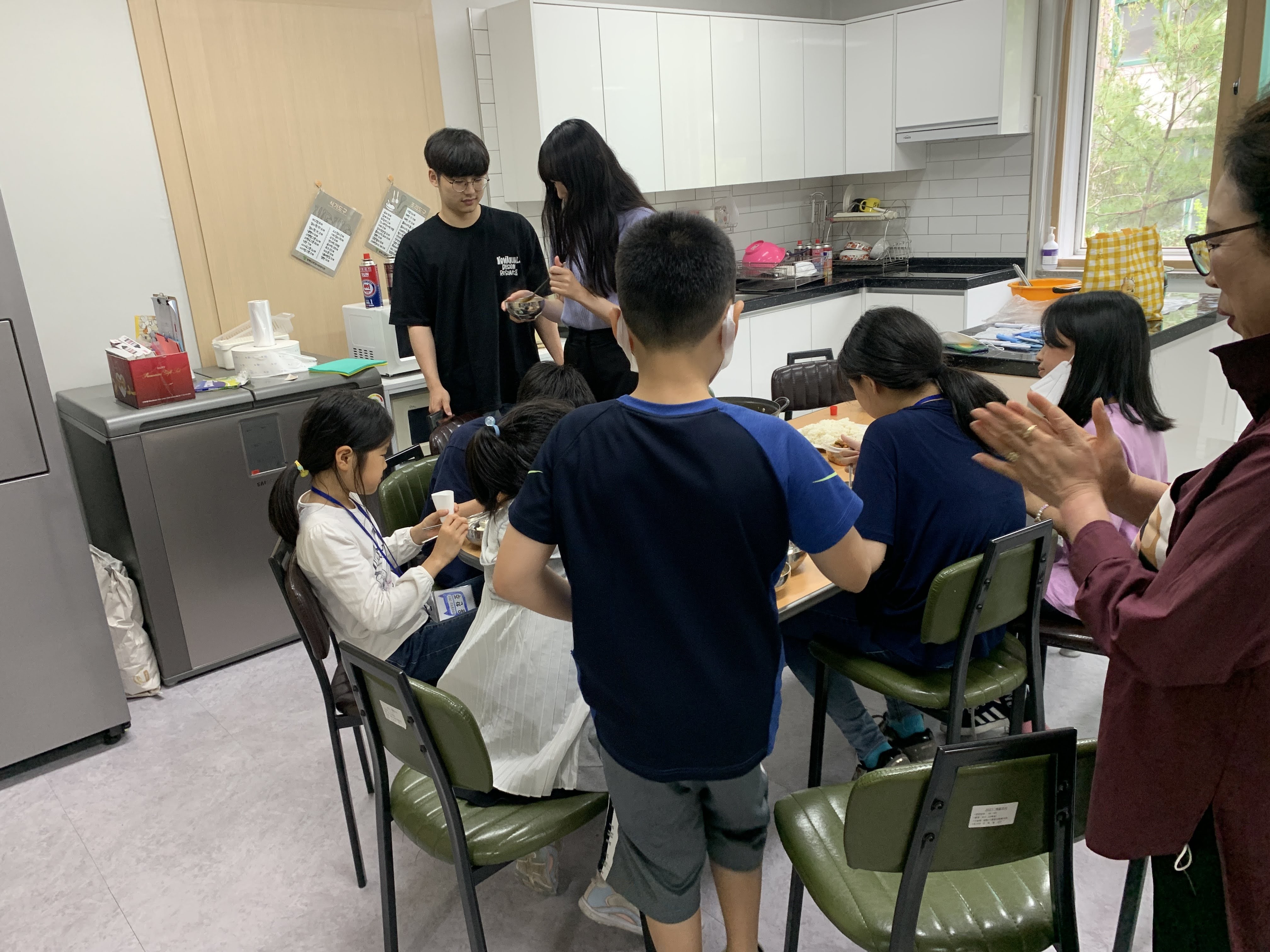 아이들과 선생님이 열심히 만든 김치볶음밥이 완성됐습니다. 다들 너무 맛있다며 김치볶음밥을 먹습니다. 선생님의 표정에는 뿌듯함이, 아이들의 표정에는 즐거움이 보입니다.