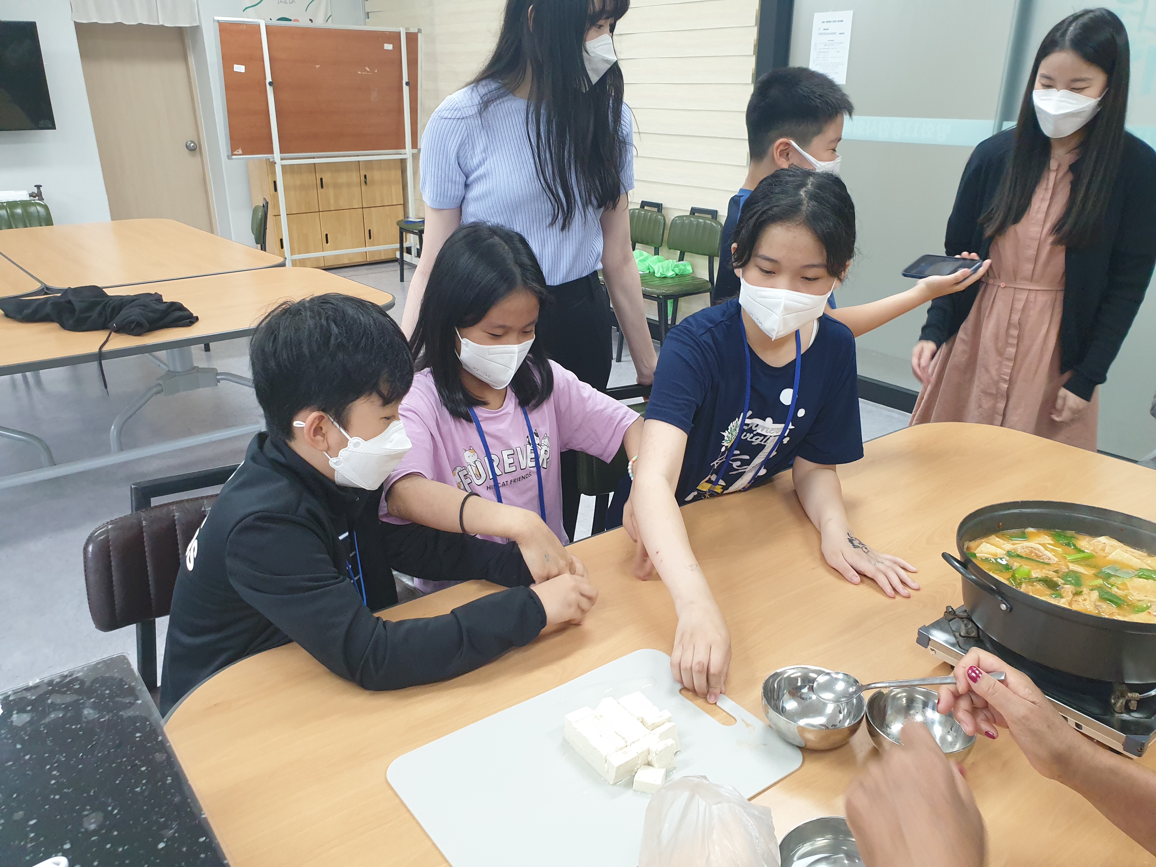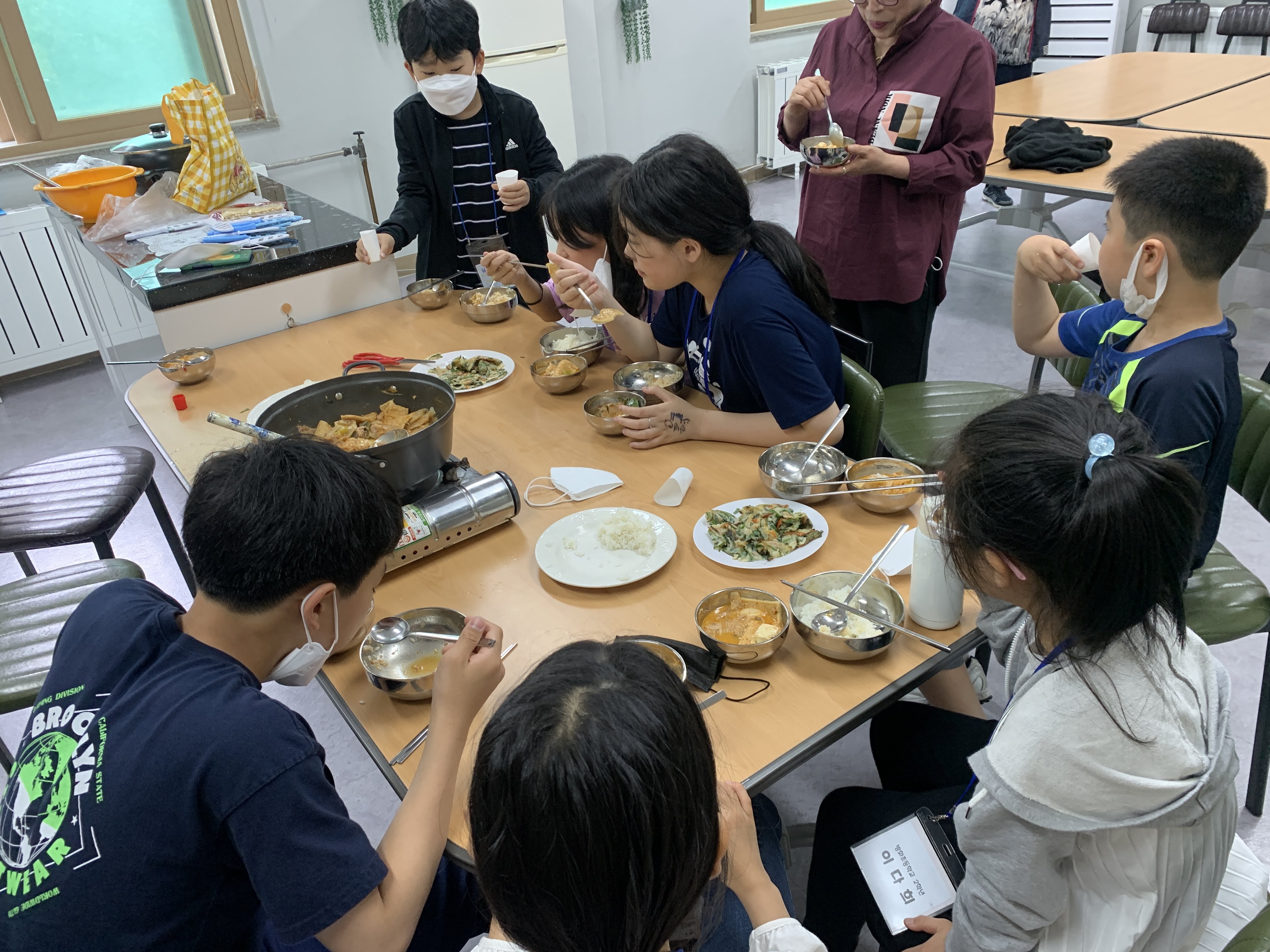 선생님과 지도하에 끓인 참치김치찌개가 완성됐습니다.