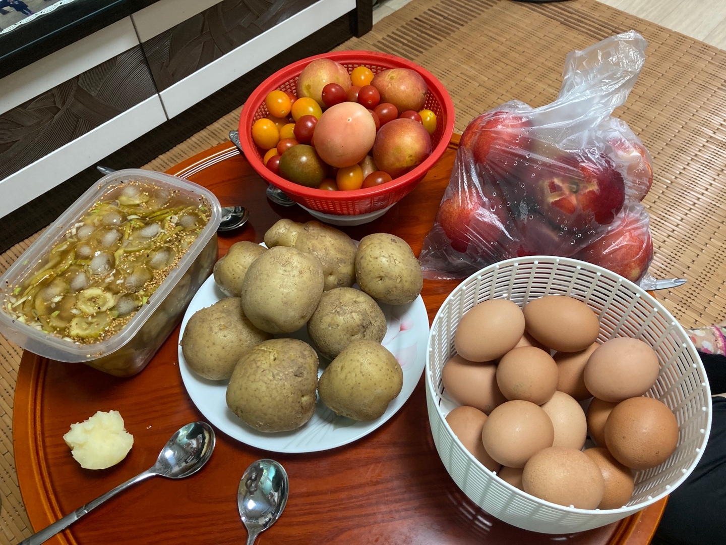 이 씨 어르신께서 삶은 감자와 토마토, 자두, 부침개, 오이냉국 등 다양한 음식을 준비하셨습니다.