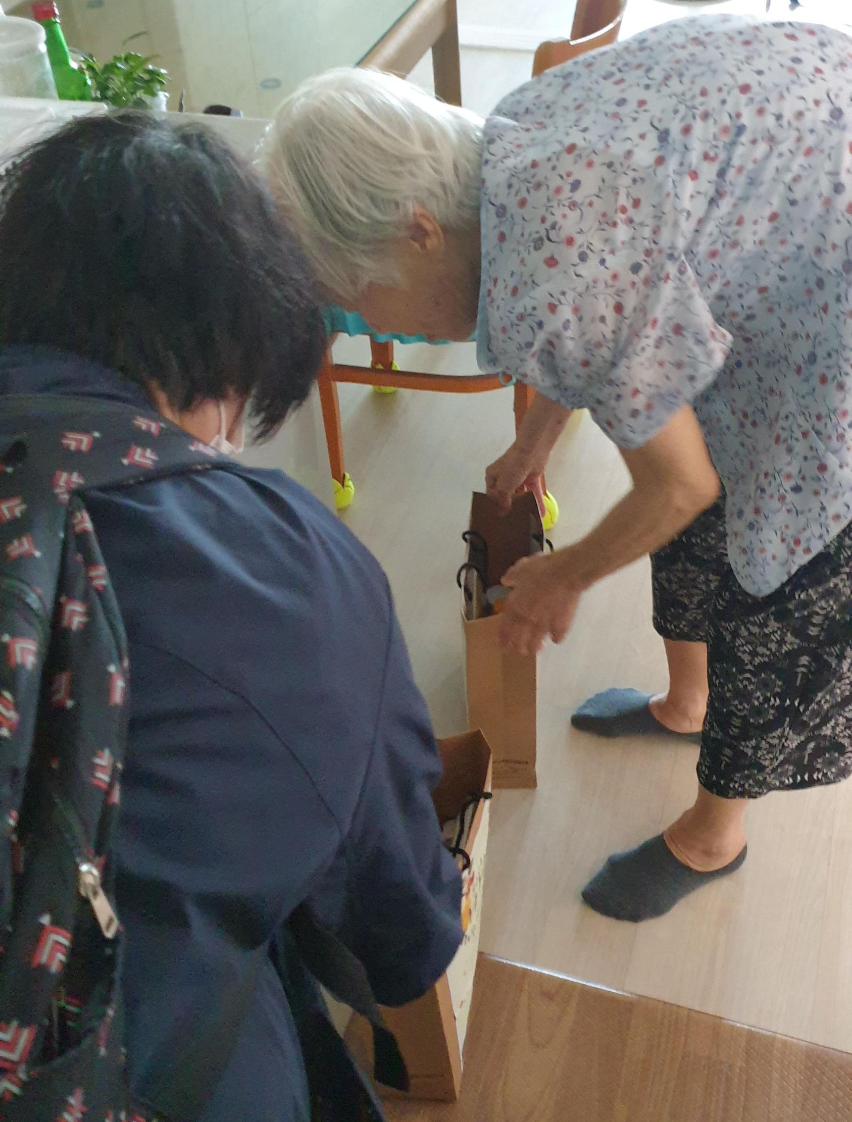 이번에 추석 꾸러미를 전달하면서 통장님과 문 씨 어르신이 처음 인사 나눌 수 있었습니다.