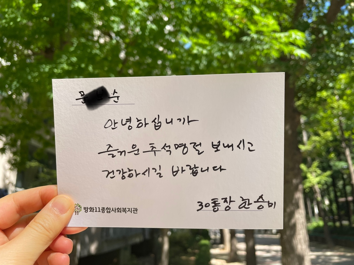 한승미 통장님께서 30통 주민들에게 추석 인사를 전하기 위해 엽서를 쓰셨습니다.