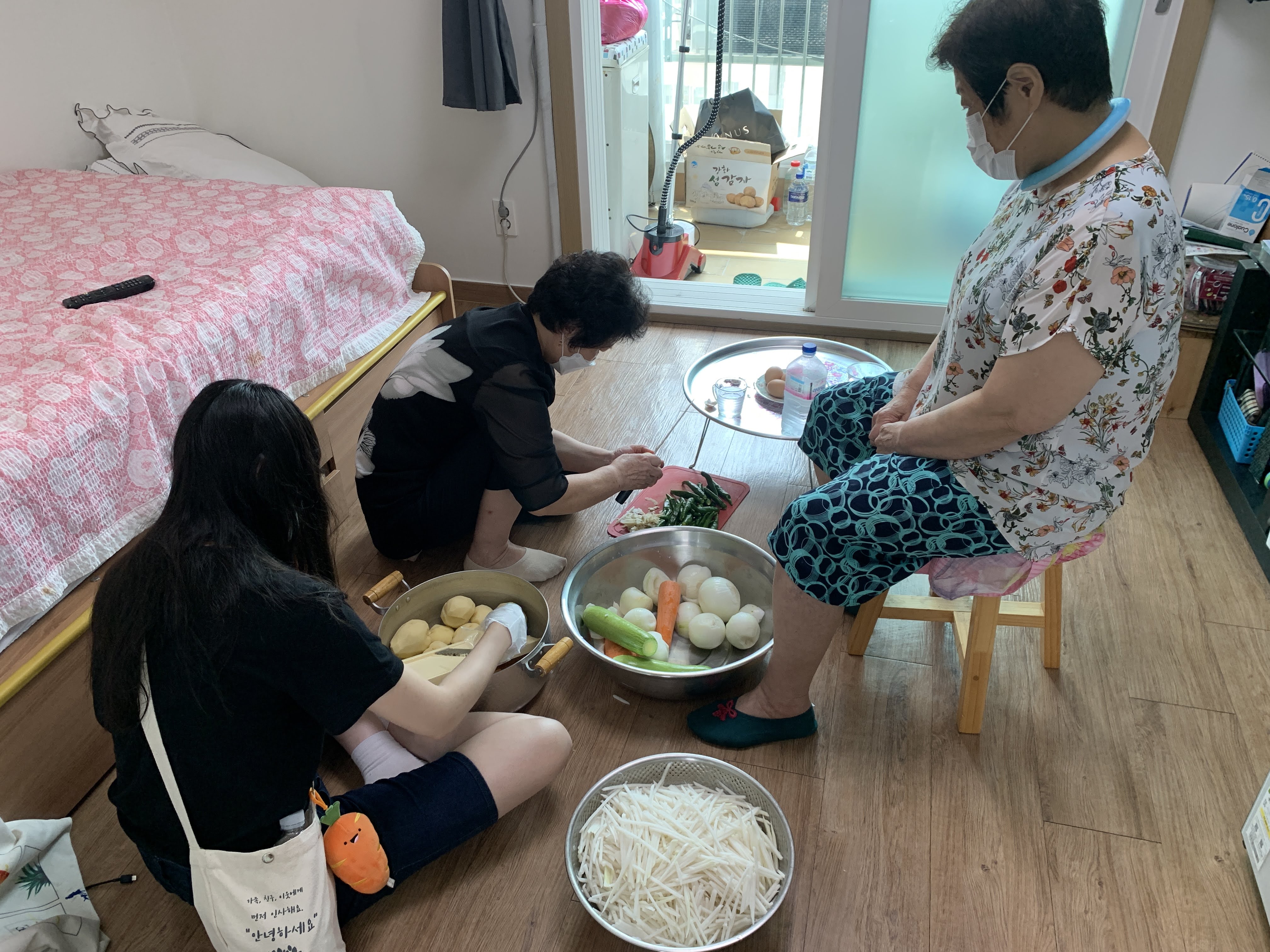 | Q. 이번 복날 잔치 어떠셨어요? A. 이웃들과 나눌 수 있어서 좋았어요. 이웃들이 환하게 웃는 모습을 생각하면서 준비한 거라 나는 기쁨이 두 배, 세 배였어요. 이번에 복지관에서 나서서 제안해줬지만, 나의 존재를 다시 한 번 생각한 계기가 되었어요. 내가 이웃들이랑 잔치한다고 했더니 여기저기서 지인들이 물질적으로나 마음으로 도움을 주셔서 우리가 생각한 것보다 더 많이 준비해서 더 많은 분들한테 나눌 수 있었잖아요. 내 마음이 부자가 된 것 같아서 지금도 좋아요. 누군가가 부침개 한쪽 갖다 드리고 싶다고 하는 분 계실 때, 그걸 드시면서 그 분이 이웃을 좋게 생각하고 나도 잔치하는데 한번 나가볼까하는 마음도 있었을 거라고 생각해요. 움츠린 마음이 좀 열렸으면 좋겠어요. 잔치가 그런 기회가 되면 좋겠다고 생각했어요. 이웃 공동체로 살아가는 거잖아요. 그러니 다 같이 나누고 살면 좋겠다고 늘 생각해요. 실천을 많이 못해도요. Q. 소수 이웃들과는 평소에 나누셨는데, 이번엔 대외적으로 크게 잔치 여셨어요. 어떤 차이가 있었나요? A. 준비할 때도 그렇고 땡볕에서 나를 도와주겠다고 이웃들이 함께하니 내가 더 살아있다고 느끼게 해주는 계기가 되었어요. 그동안 일하고 사는 게 바빠서 이웃들을 잘 몰랐어요. 그냥 지나가다 만나면 인사하는 정도였죠. 음식을 나눌 때도 이웃들과 협력하면서 준비한 건 처음이에요. 내가 부족한 건 이웃들이 채워주고, 이웃들이 어려워하는 건 내가 하고, 이렇게도 할 수 있다는 걸 알게 되었어요. 같이 테이블에서 모여서 같이 음식을 나누면서, 이웃들도 더 친해지고, 그 후에 길에서 보면 인사할 수 있어서 좋았어요. 다 같이 함께할 수 있다는 것 자체가 좋았어요. 함께한다는 의미를 생각했어요. Q. 기억에 남는 분들이 계신가요? A. 13층 사시는 분들이요. 저희 집에 와서 재료 손질 도와주신 분들 기억에 확실히 남죠. 그리고 동네 할머니들이 인사를 많이 하세요. 특히 1동 사시는 할머니.그분이 늘 화분 가꾸고 계시는데 평소에 지나갈 때 인사하고 작은 거라도 드려요. 어르신 덕분에 예쁜 꽃들을 볼 수 있어서 고마워서요. 잔치하는데 그분이 지나가시기에 얼른 가서 모시고 왔어요. 드시고 가시라고. 고마운 마음을 이렇게 표현할 수 있어서 좋았어요. Q. 직접 잔치 열지는 못하지만, 돕는 일에는 기꺼이 동참해주시는 분들이 계시다는 것을 이번에 알게 되어서 참 감사했어요. A. 어르신들은 젊은 사람보다 산전수전 다 겪으셨잖아요. 뭘 하자고 하면 더 나서주실 거라는 생각이 들어요. 내가 반찬 조금 나누는 거랑, 이렇게 잔치하는 거랑 비용 차이가 커요. 저도 지인들이 찬조하지 않았다면, 어려웠죠. 다음에 할 때는 홍보지에 같이 할 사람, 재료 보태줄 사람 모집해서 하면 좋겠어요. 다음에도 선두대장 할테니까, 15층으로 몇 시까지 오시라고하고, 남녀노소 구분 없이 초대하면 좋겠어요. 전날에 재료 모아서 아침에 준비해서 진행하면 좋잖아요. Q. 동네에서 이웃과 꾸준히 나누면 어떤 변화가 생길까요? A. 이렇게 조금씩 모아서 잔치하면 이웃 간에 정도 쌓이고 사랑도 쌓이죠. Q. 다음에도 잔치에 참여할 마음이 있으세요? A. 앞으로 이렇게 자주 해요. |