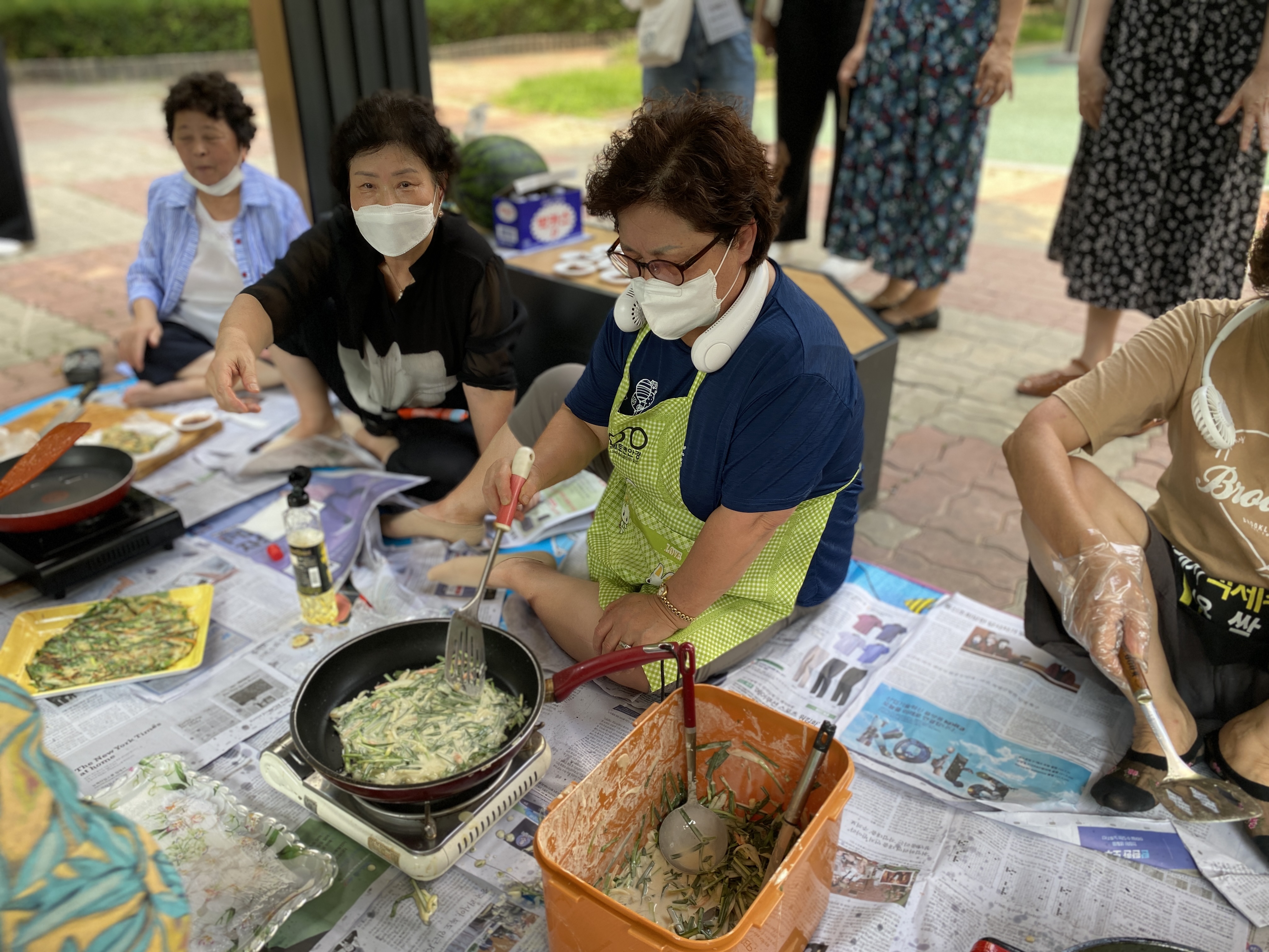 | Q. 이번 복날 잔치 어떠셨어요? A. 이웃들과 나눌 수 있어서 좋았어요. 이웃들이 환하게 웃는 모습을 생각하면서 준비한 거라 나는 기쁨이 두 배, 세 배였어요. 이번에 복지관에서 나서서 제안해줬지만, 나의 존재를 다시 한 번 생각한 계기가 되었어요. 내가 이웃들이랑 잔치한다고 했더니 여기저기서 지인들이 물질적으로나 마음으로 도움을 주셔서 우리가 생각한 것보다 더 많이 준비해서 더 많은 분들한테 나눌 수 있었잖아요. 내 마음이 부자가 된 것 같아서 지금도 좋아요. 누군가가 부침개 한쪽 갖다 드리고 싶다고 하는 분 계실 때, 그걸 드시면서 그 분이 이웃을 좋게 생각하고 나도 잔치하는데 한번 나가볼까하는 마음도 있었을 거라고 생각해요. 움츠린 마음이 좀 열렸으면 좋겠어요. 잔치가 그런 기회가 되면 좋겠다고 생각했어요. 이웃 공동체로 살아가는 거잖아요. 그러니 다 같이 나누고 살면 좋겠다고 늘 생각해요. 실천을 많이 못해도요. Q. 소수 이웃들과는 평소에 나누셨는데, 이번엔 대외적으로 크게 잔치 여셨어요. 어떤 차이가 있었나요? A. 준비할 때도 그렇고 땡볕에서 나를 도와주겠다고 이웃들이 함께하니 내가 더 살아있다고 느끼게 해주는 계기가 되었어요. 그동안 일하고 사는 게 바빠서 이웃들을 잘 몰랐어요. 그냥 지나가다 만나면 인사하는 정도였죠. 음식을 나눌 때도 이웃들과 협력하면서 준비한 건 처음이에요. 내가 부족한 건 이웃들이 채워주고, 이웃들이 어려워하는 건 내가 하고, 이렇게도 할 수 있다는 걸 알게 되었어요. 같이 테이블에서 모여서 같이 음식을 나누면서, 이웃들도 더 친해지고, 그 후에 길에서 보면 인사할 수 있어서 좋았어요. 다 같이 함께할 수 있다는 것 자체가 좋았어요. 함께한다는 의미를 생각했어요. Q. 기억에 남는 분들이 계신가요? A. 13층 사시는 분들이요. 저희 집에 와서 재료 손질 도와주신 분들 기억에 확실히 남죠. 그리고 동네 할머니들이 인사를 많이 하세요. 특히 1동 사시는 할머니.그분이 늘 화분 가꾸고 계시는데 평소에 지나갈 때 인사하고 작은 거라도 드려요. 어르신 덕분에 예쁜 꽃들을 볼 수 있어서 고마워서요. 잔치하는데 그분이 지나가시기에 얼른 가서 모시고 왔어요. 드시고 가시라고. 고마운 마음을 이렇게 표현할 수 있어서 좋았어요. Q. 직접 잔치 열지는 못하지만, 돕는 일에는 기꺼이 동참해주시는 분들이 계시다는 것을 이번에 알게 되어서 참 감사했어요. A. 어르신들은 젊은 사람보다 산전수전 다 겪으셨잖아요. 뭘 하자고 하면 더 나서주실 거라는 생각이 들어요. 내가 반찬 조금 나누는 거랑, 이렇게 잔치하는 거랑 비용 차이가 커요. 저도 지인들이 찬조하지 않았다면, 어려웠죠. 다음에 할 때는 홍보지에 같이 할 사람, 재료 보태줄 사람 모집해서 하면 좋겠어요. 다음에도 선두대장 할테니까, 15층으로 몇 시까지 오시라고하고, 남녀노소 구분 없이 초대하면 좋겠어요. 전날에 재료 모아서 아침에 준비해서 진행하면 좋잖아요. Q. 동네에서 이웃과 꾸준히 나누면 어떤 변화가 생길까요? A. 이렇게 조금씩 모아서 잔치하면 이웃 간에 정도 쌓이고 사랑도 쌓이죠. Q. 다음에도 잔치에 참여할 마음이 있으세요? A. 앞으로 이렇게 자주 해요. |