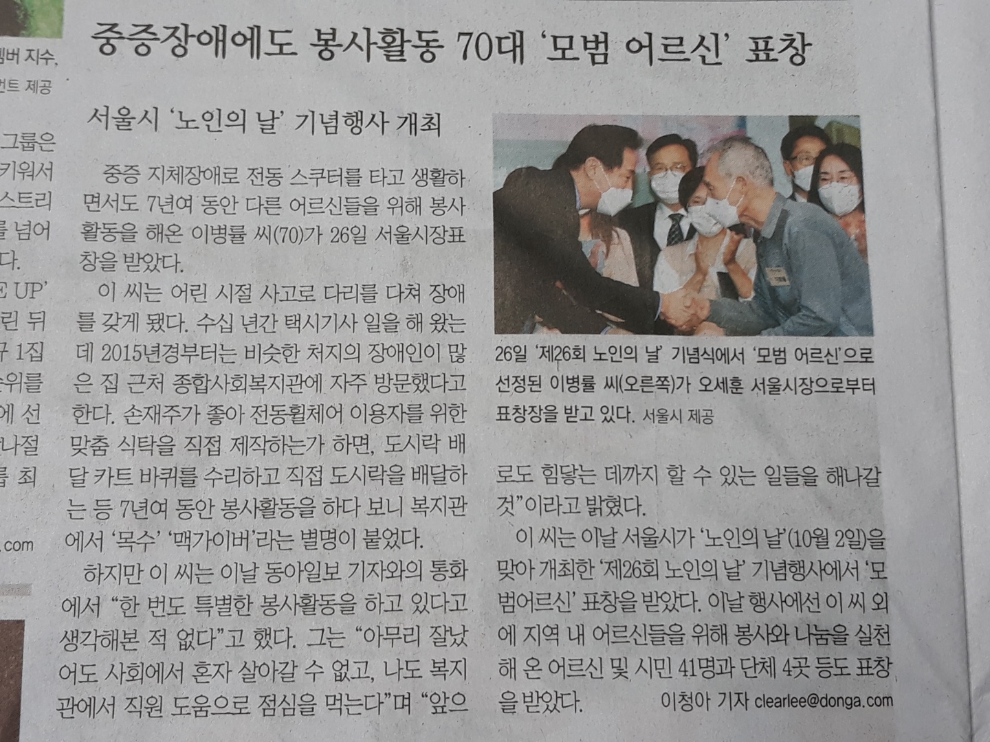 [자원봉사] 이병률 어르신 제26회 노인의 날 모범 어르신 부문 '서울특별시장 표창' 수상!