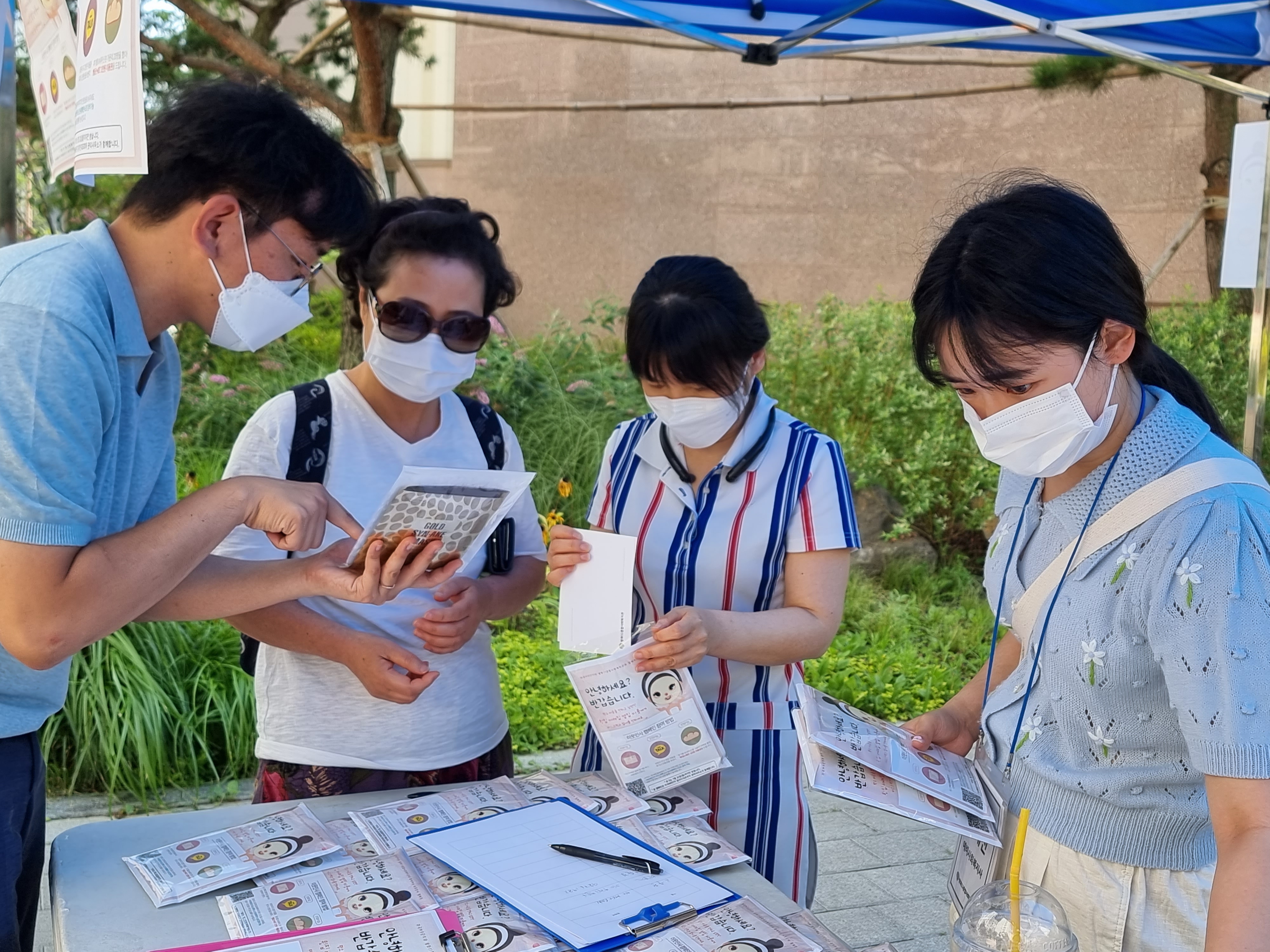 마스크팩이 잘 보이게 테이블에 올려 놓고, 인사캠페인 홍보지도 테이블과 천막 곳곳에 붙였습니다.