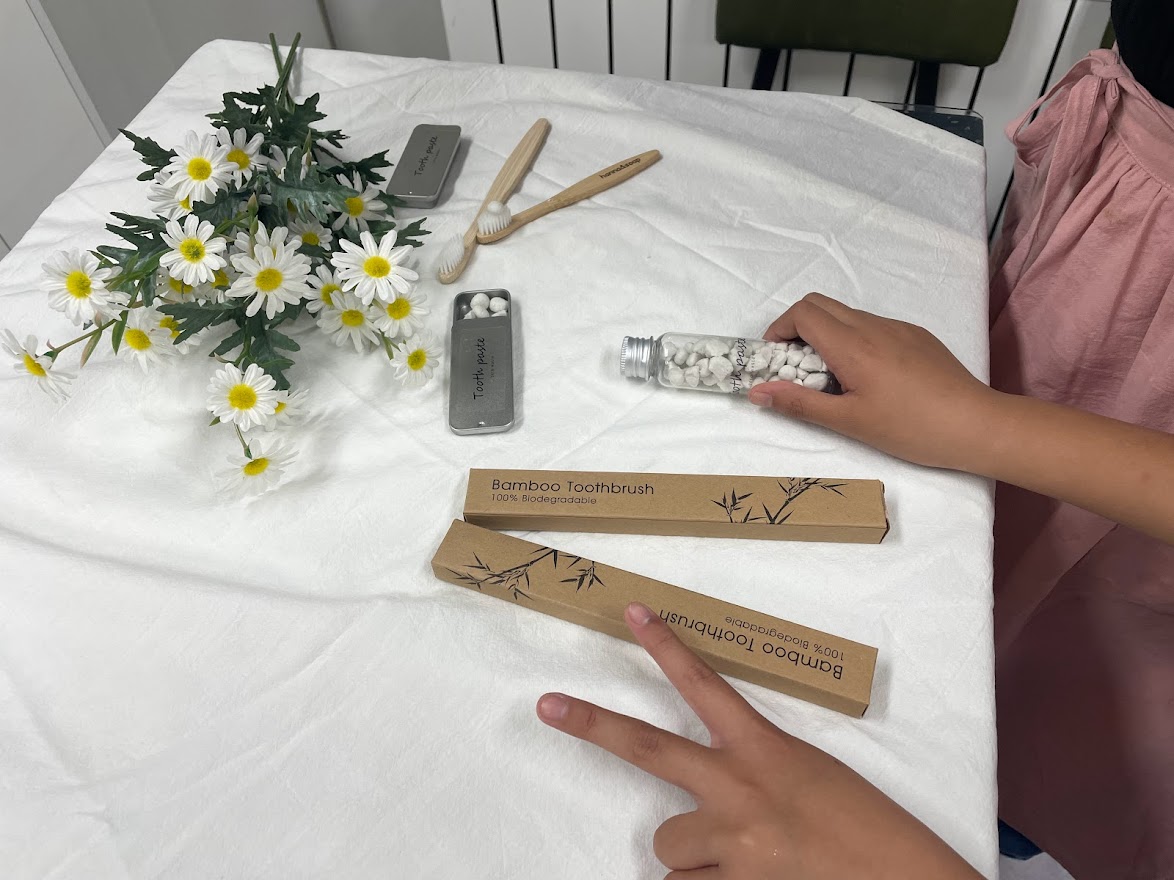 대나무 칫솔과 고체치약은 썩지 않는 쓰레기 배출을 최대한 줄여보자는 마음에서 나왔습니다.