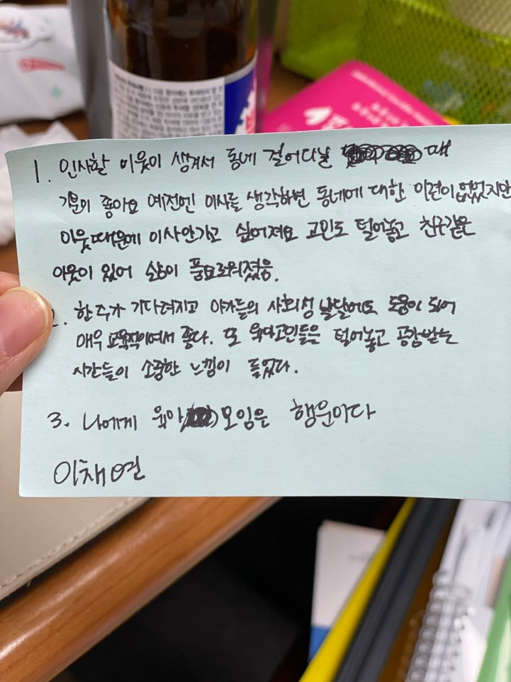2. 이웃은 서먹한 사람들이었는데 우연히 마주치면 인사할 사람들이 꽤 많이 생기면서 동네에 대한 기대감이 많이 올라갔다. 이웃이란 말에 정이 생긴 듯하다.