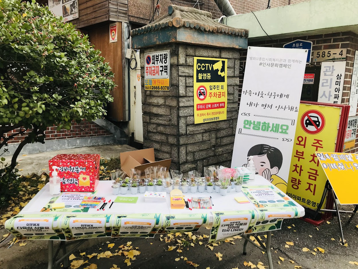 삼미아파트 정문 쪽에 테이블을 펴고 인사캠페인을 알리는 배너를 펼치고 귀여운 다육이 화분을 올려 사람들의 이목을 끌 수 있게 세팅했습니다.