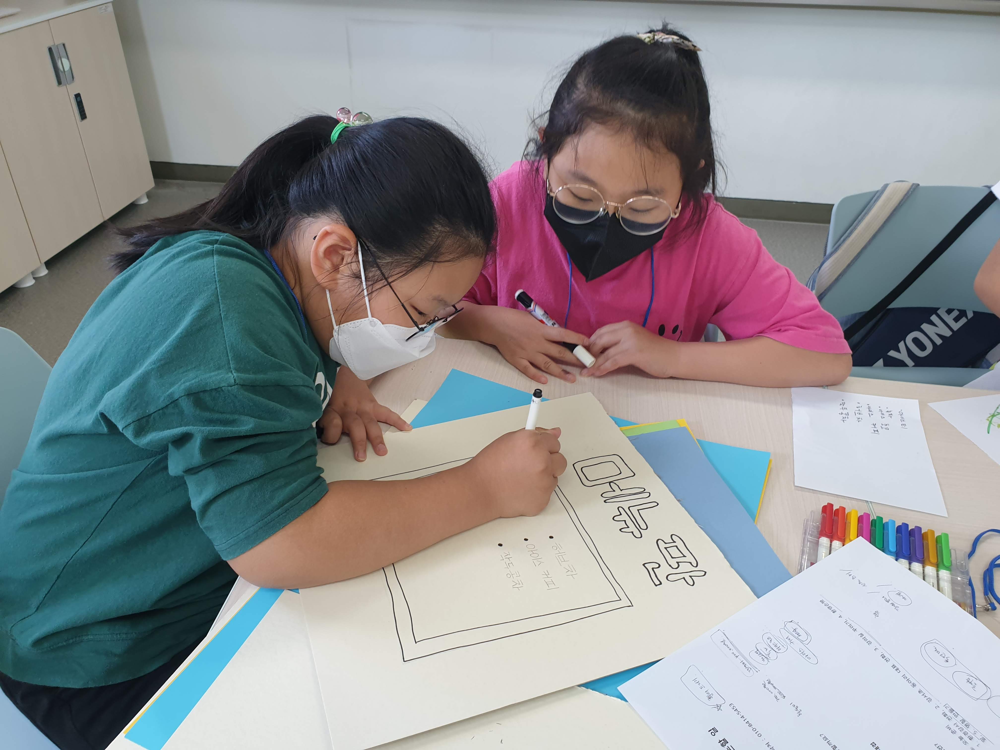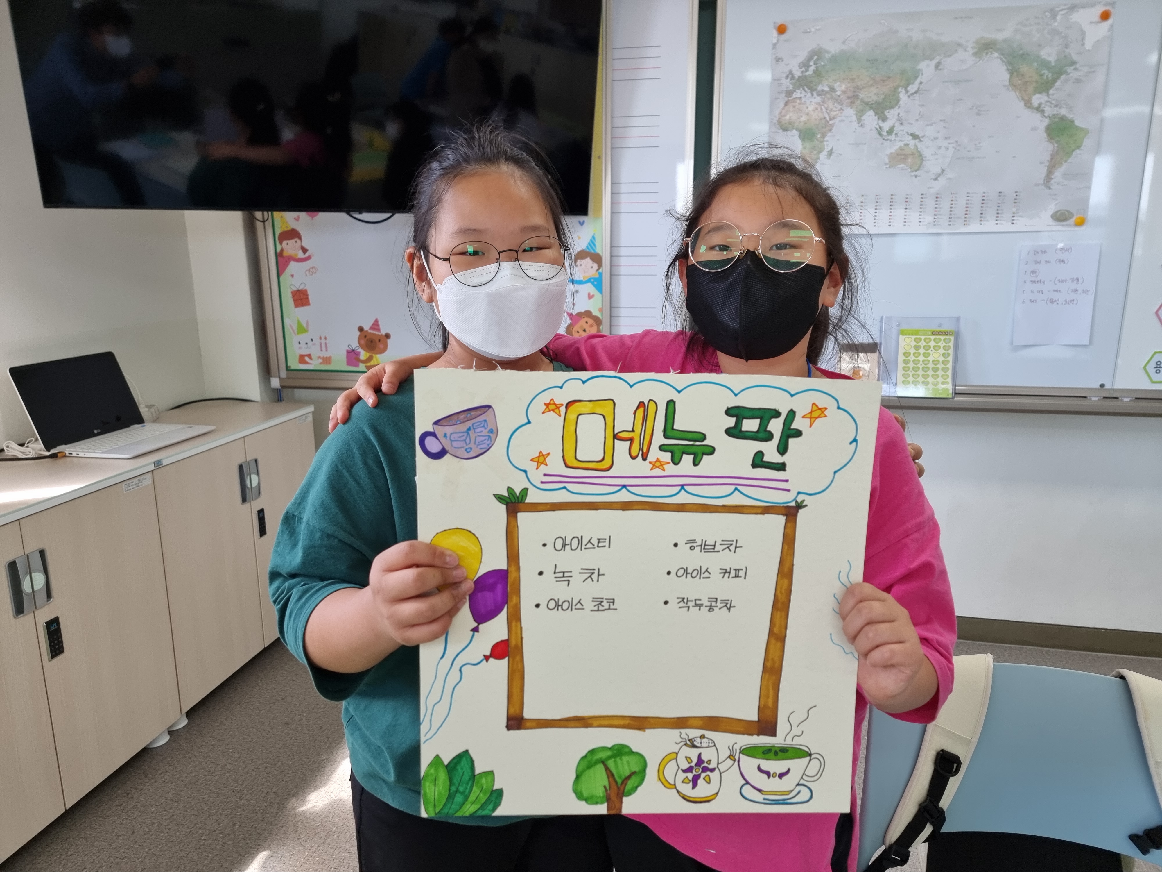 꾸미기팀도 강사님 맞을 준비를 했습니다. 교문으로 배웅 나갈 때 환영할 팻말을 만들었습니다. 강사님께 차 대접을 할 때 사용할 메뉴판도 만들었습니다. 알록달록 예쁜 색으로 꾸몄습니다. 이렇게 환경 강의 준비가 끝났습니다.