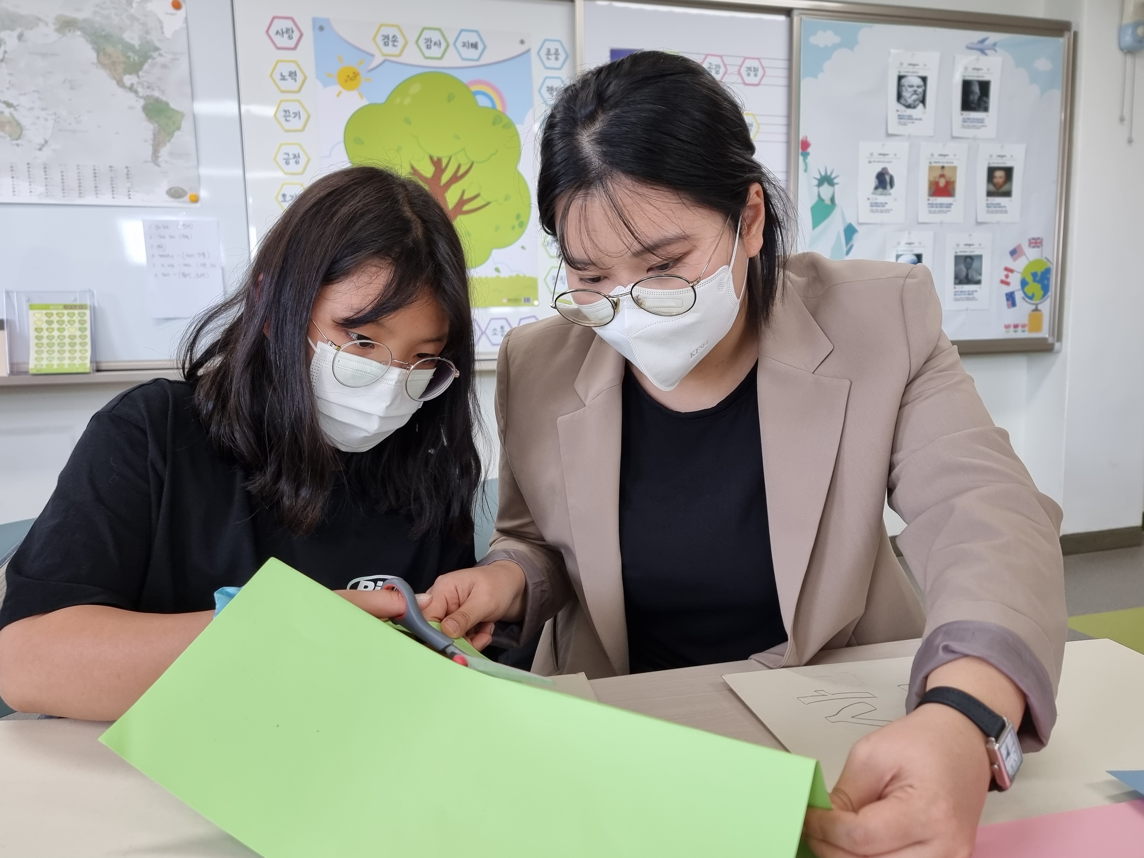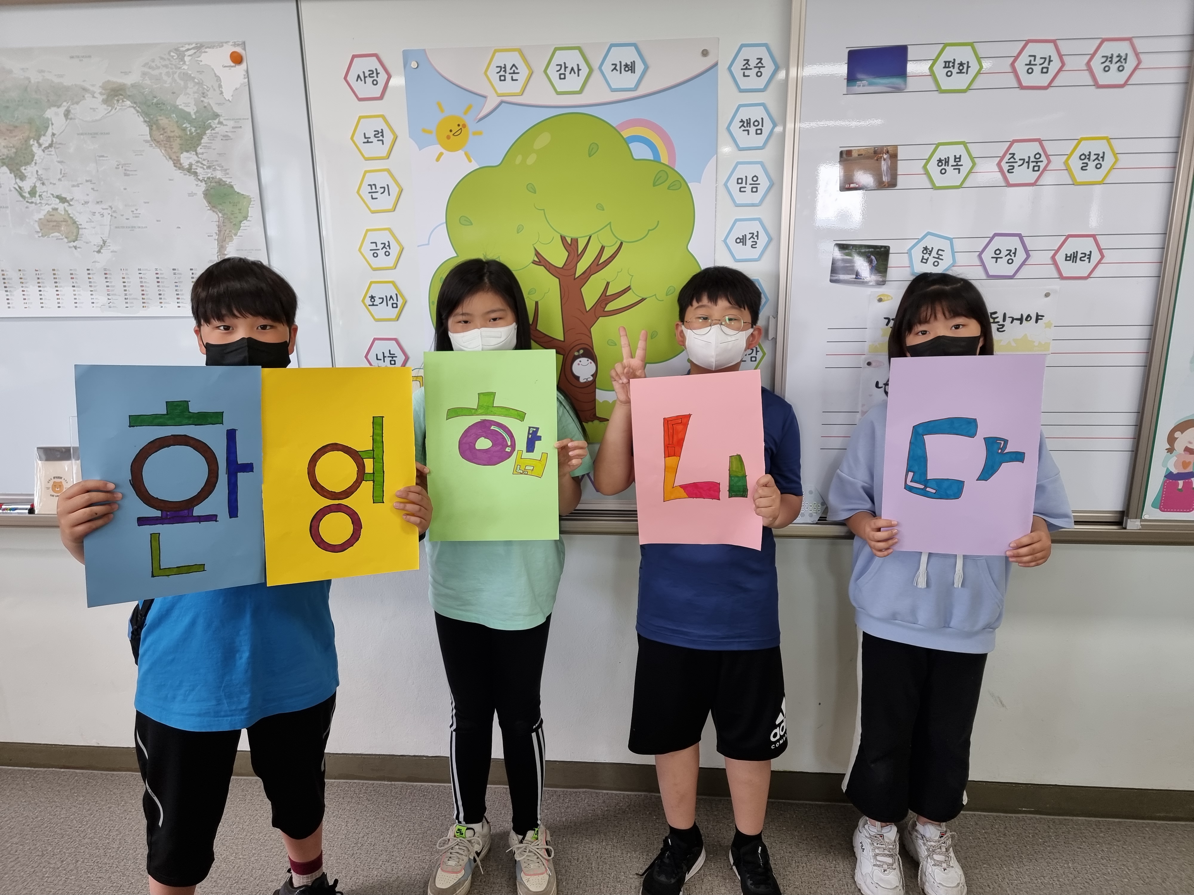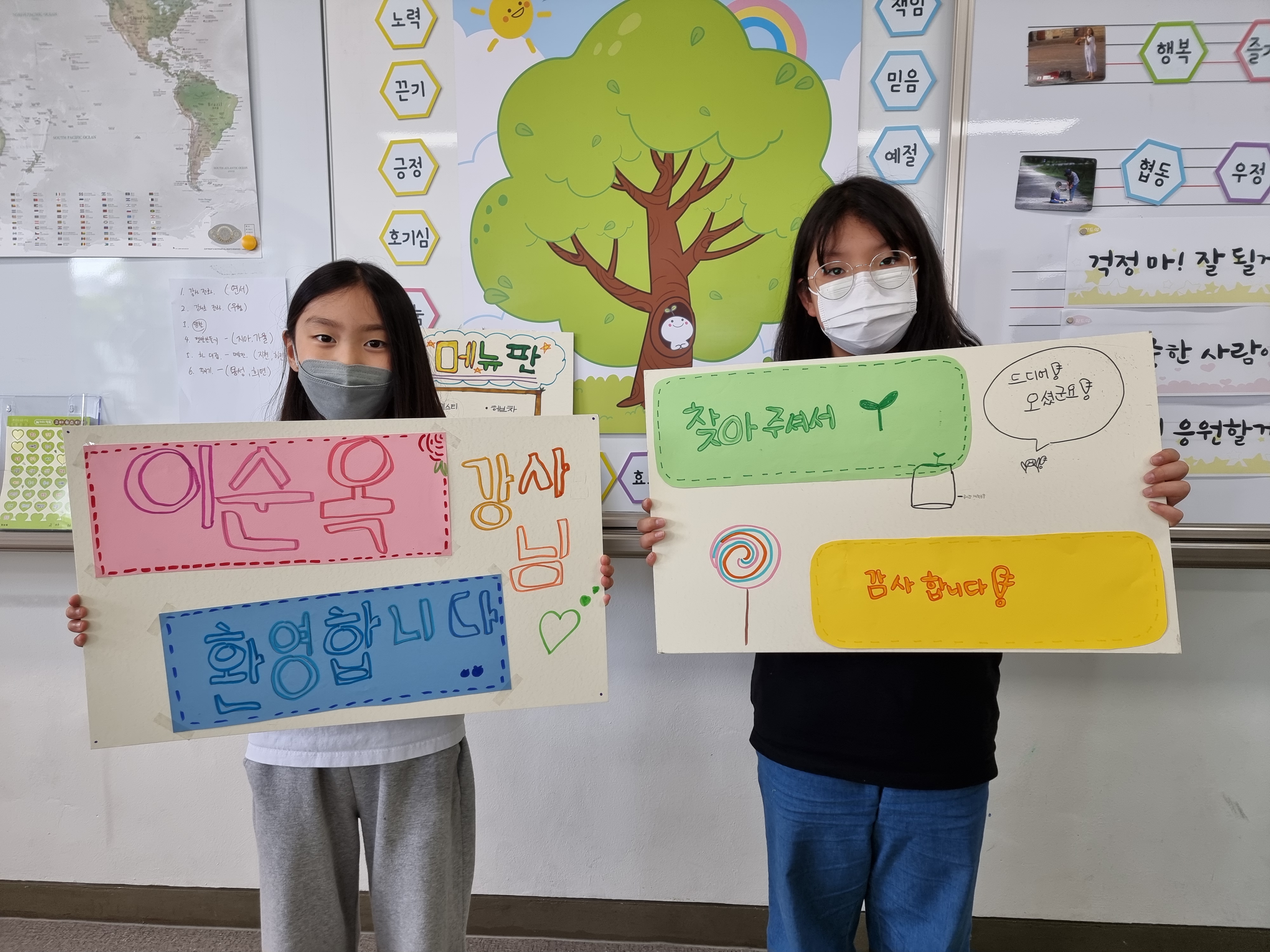 꾸미기팀도 강사님 맞을 준비를 했습니다. 교문으로 배웅 나갈 때 환영할 팻말을 만들었습니다. 강사님께 차 대접을 할 때 사용할 메뉴판도 만들었습니다. 알록달록 예쁜 색으로 꾸몄습니다. 이렇게 환경 강의 준비가 끝났습니다.