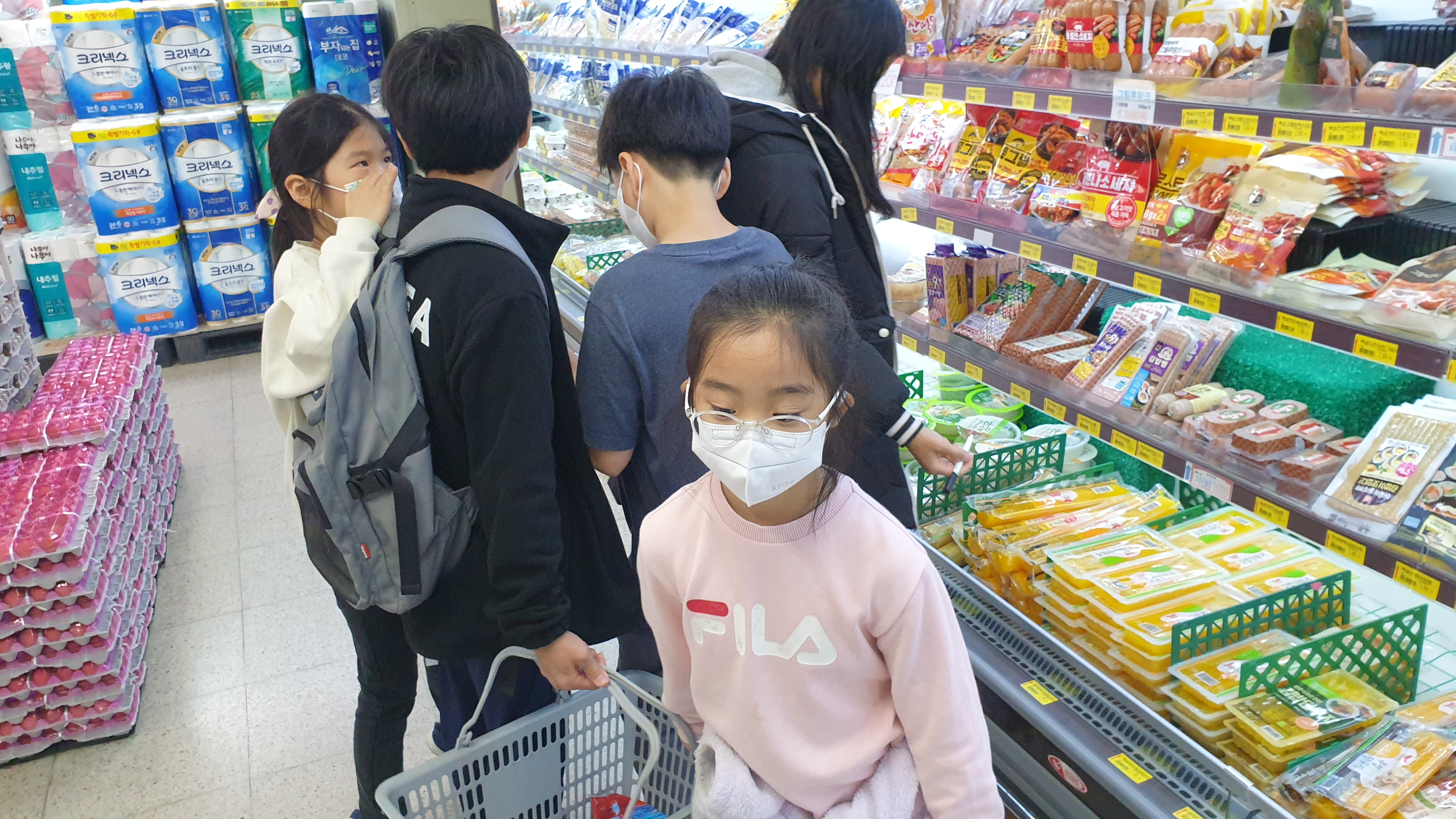 오늘 아이들은 김경옥 선생님 덕분에 가게 안에서 필요한 재료를 찾고 예산에 맞추어 사는 법을 배웠습니다.