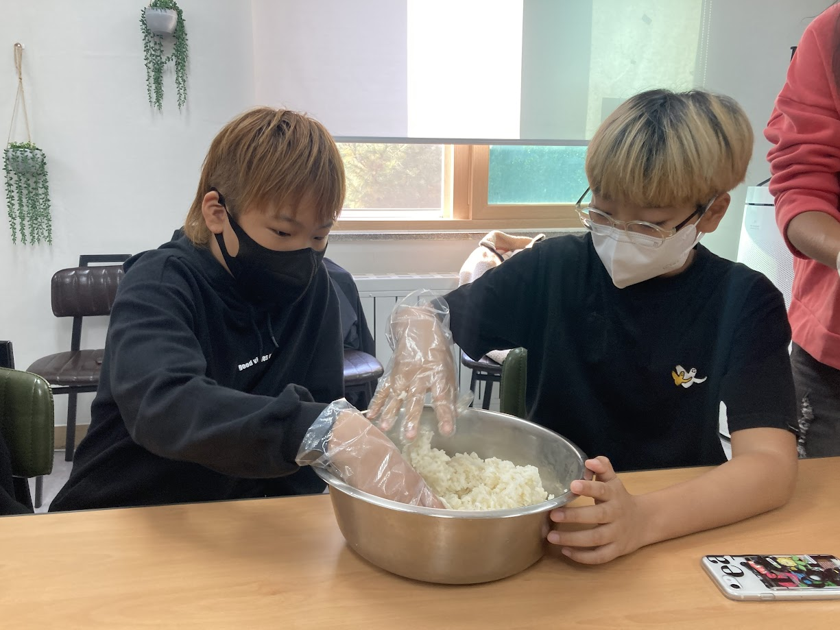 재료를 모두 나누어 자리 앞에 놓고 본격적으로 김밥 만들기를 시작합니다.