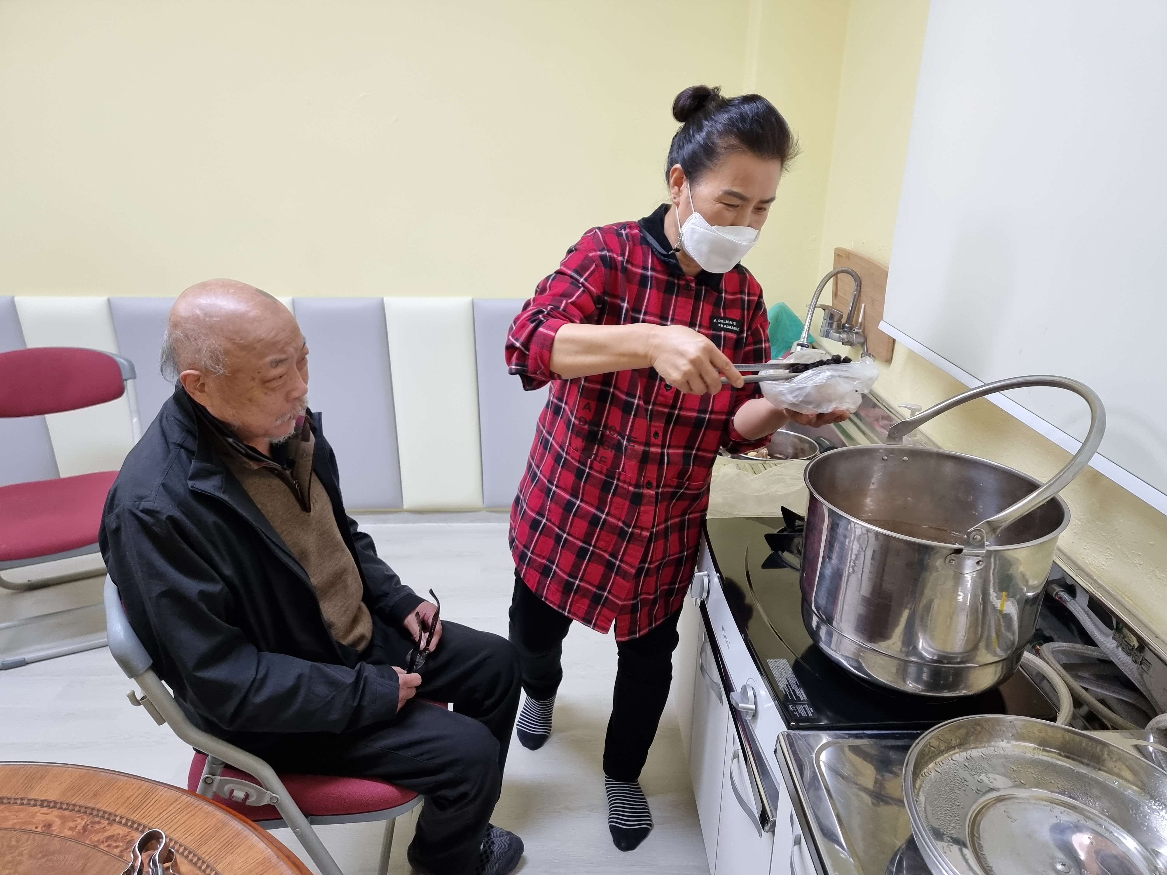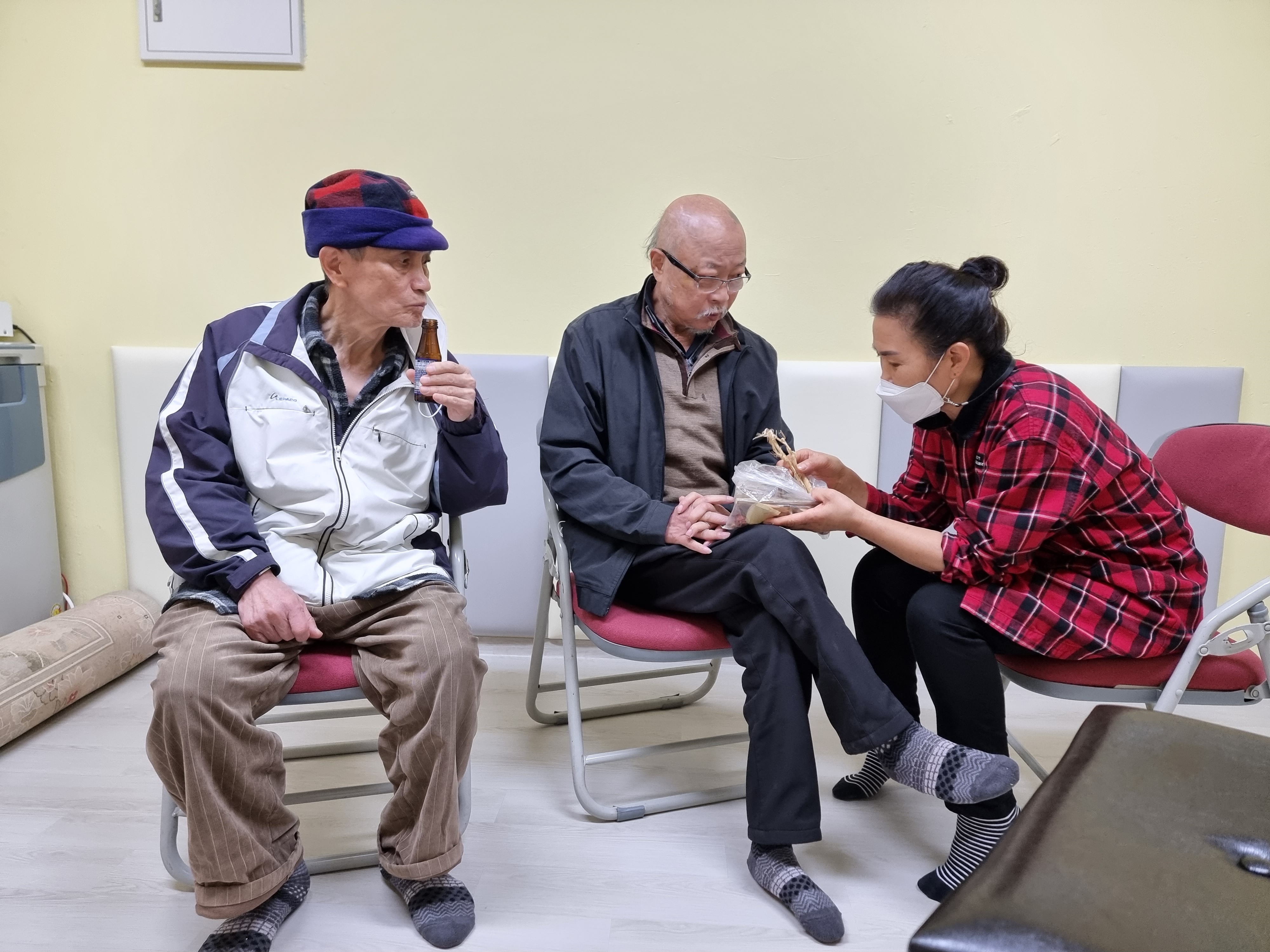 수육을 삶기 시작했습니다. 감사님께서 김덕영 님께 어떤 재료를 넣을지 여쭈었습니다. 김덕영 님은 자리에 앉아서 하나하나 말씀하셨습니다. 이창숙 단장님은 김덕영 님과 자연스럽게 대화를 하셨습니다. 한 달에 한 번 도시락을 배달할 때는 반찬만 드리고 돌아서기에 바빴습니다. 수육을 삶는데 한 시간 정도 걸릴 동안 고향이 어디인지 나이가 몇인지 어떻게 살아오셨는지 자연스럽게 이야기 나눴습니다. 김덕영 님께 좋아하시는 노래가 있는지 여쭈었습니다. 바로 한가락 불러주셨습니다. 저는 잘 모르는 오래된 노래였지만 모두 알고 있는 노래 셨습니다. 함께 흥얼거렸습니다. 잔치 분위기가 물씬 납니다.