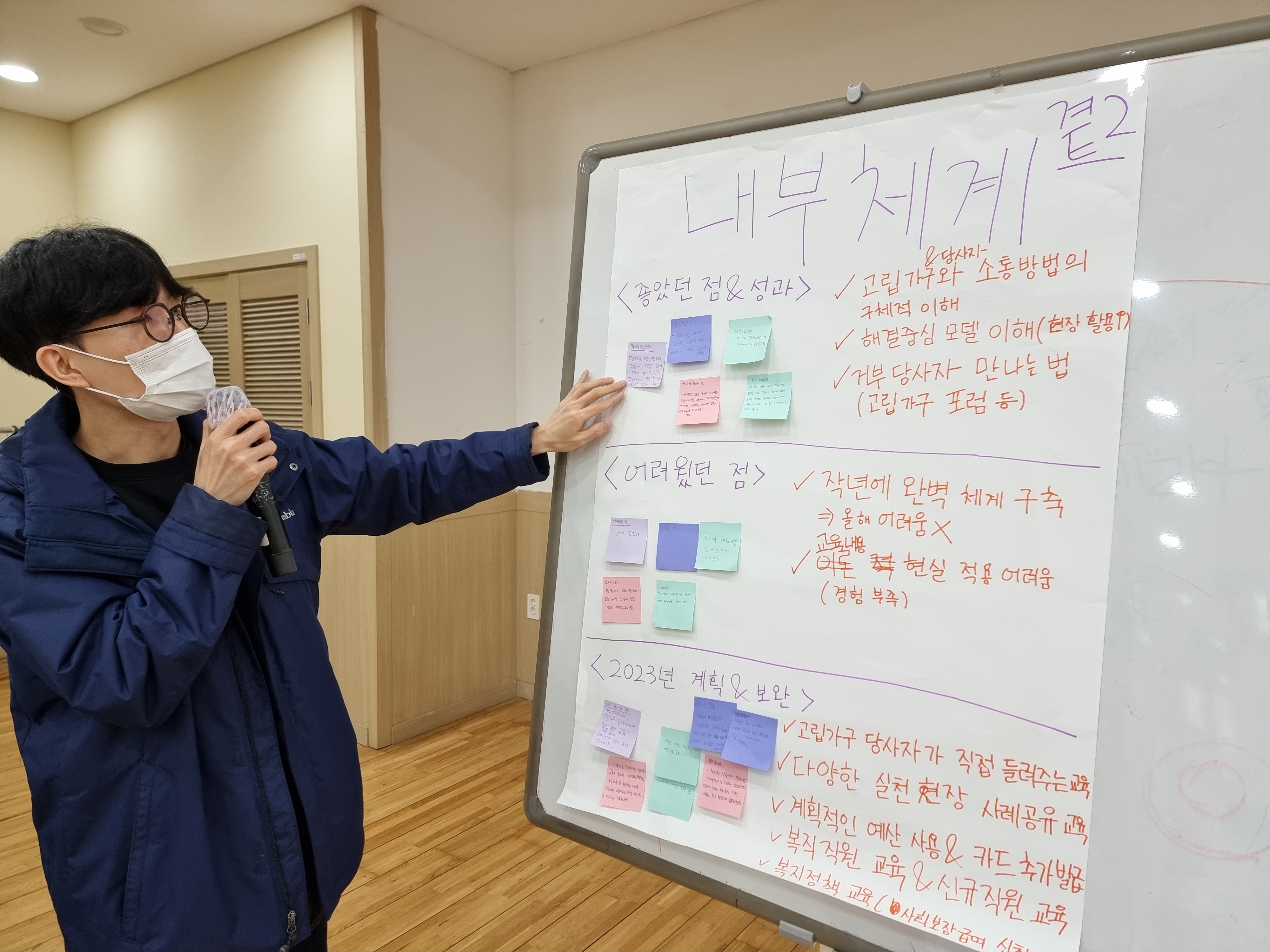 | 23년 계획 | ① 다양한 실천현장 사례를 듣는 재단교육에 참여하거나 내부 직원교육으로 진행함. ② 새롭게 입사한 직원 4명과 육아휴직에서 복직한 직원에게 다양한 교육을 진행하기로 함. ③ 사회복지전담공무원에게 다양한 복지정책 교육을 들으면 좋겠음. ④ 상반기에는 외부 후원물품을 우선 사용하다보니 하반기에 ‘잇다’ 사업예산을 자주 사용할 때 체크카드 1장이 부족했음. 2장으로 늘려 지출에 좀 더 유연하게 하고자함. |
