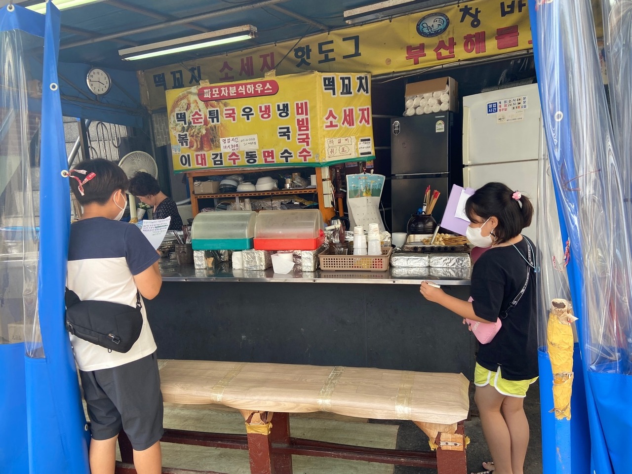 아이들과 떡볶이 사장님께 떡볶이 안 맵게 만드는 비법을 알아 오려고 합니다.