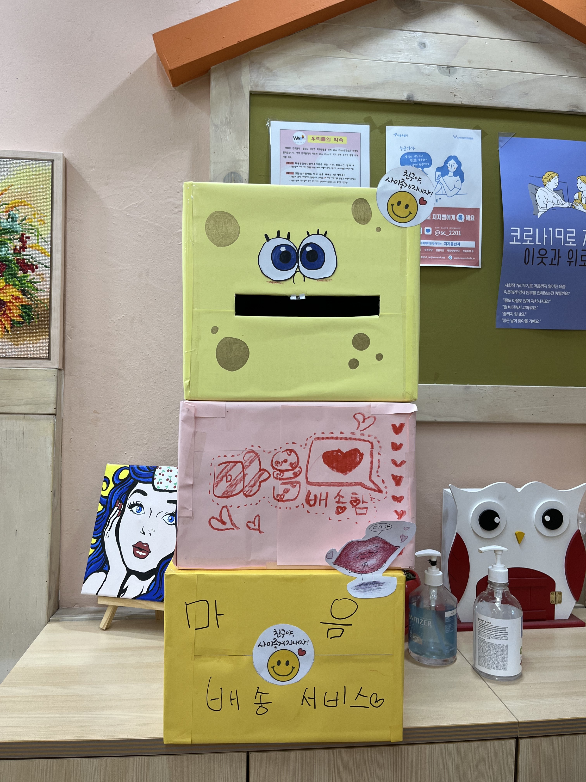 점심시간마다 엽서를 받으러 다닐 때 필요한 마음 배송함도 직접 만들었습니다.