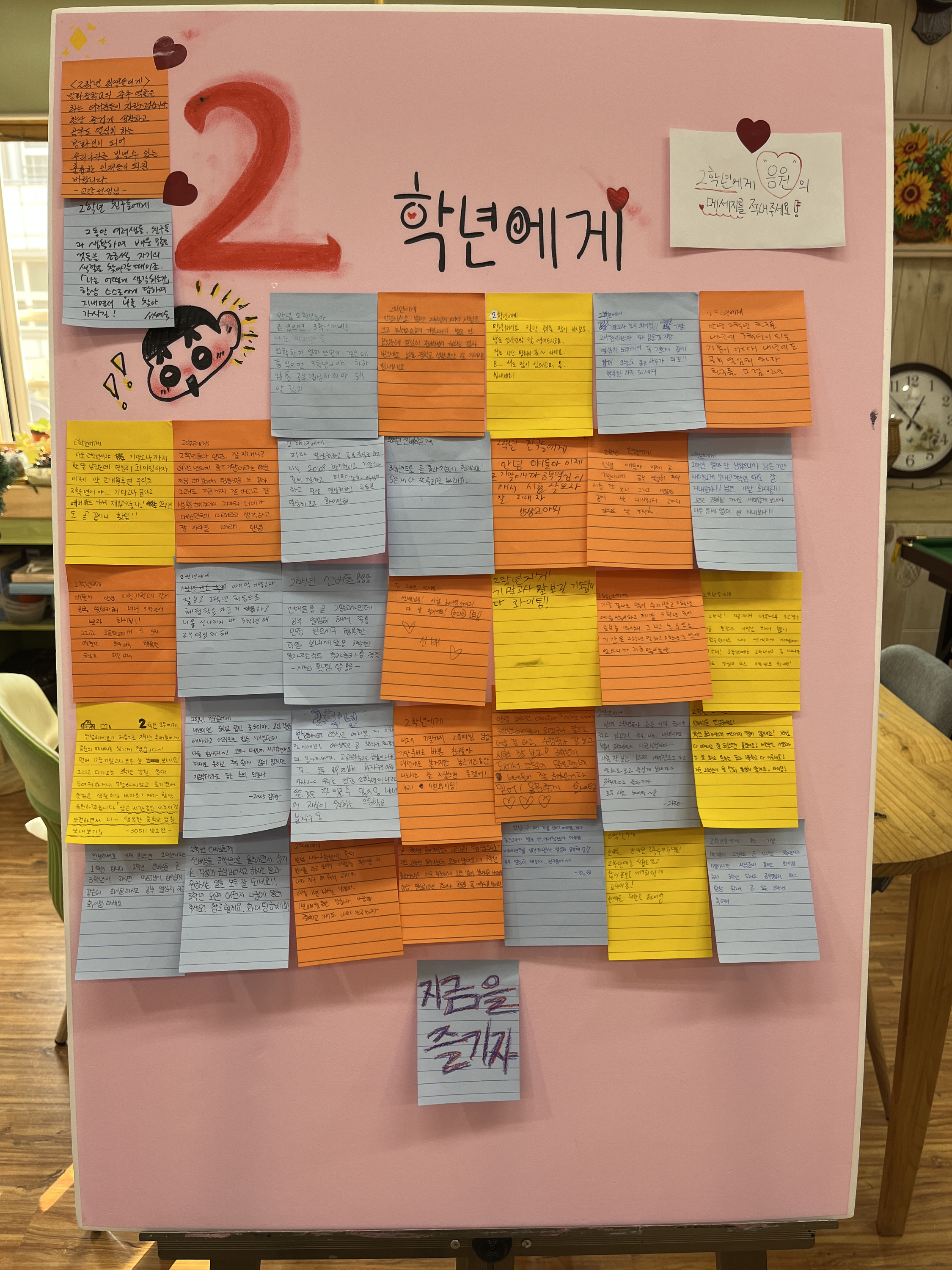 -선배들께서 남긴 말들을 보며 감동 받았고 신기했어요. 편지를 쓰면서 곧 2학년이 된다는 사실에 슬펐어요ㅜㅠ