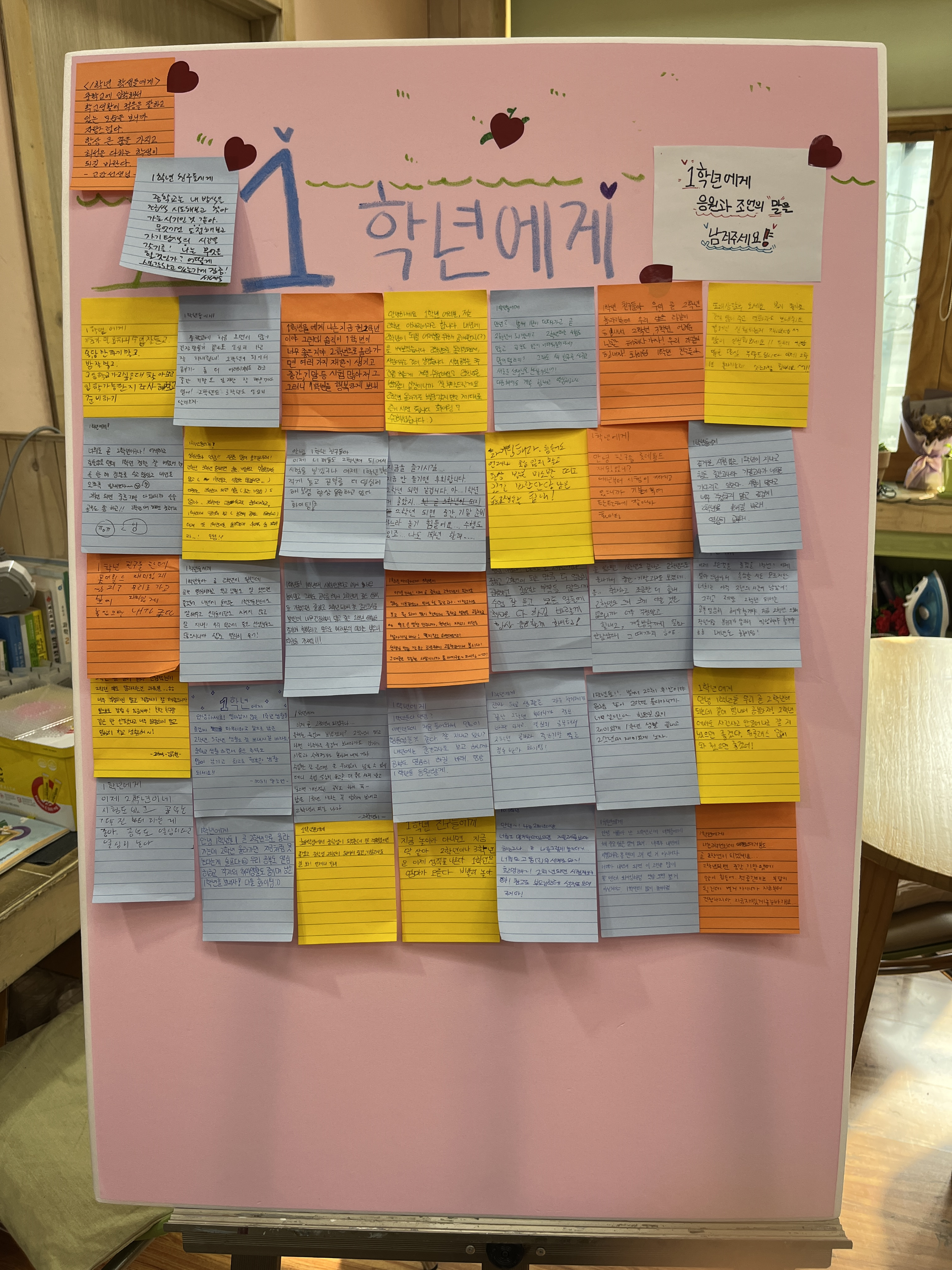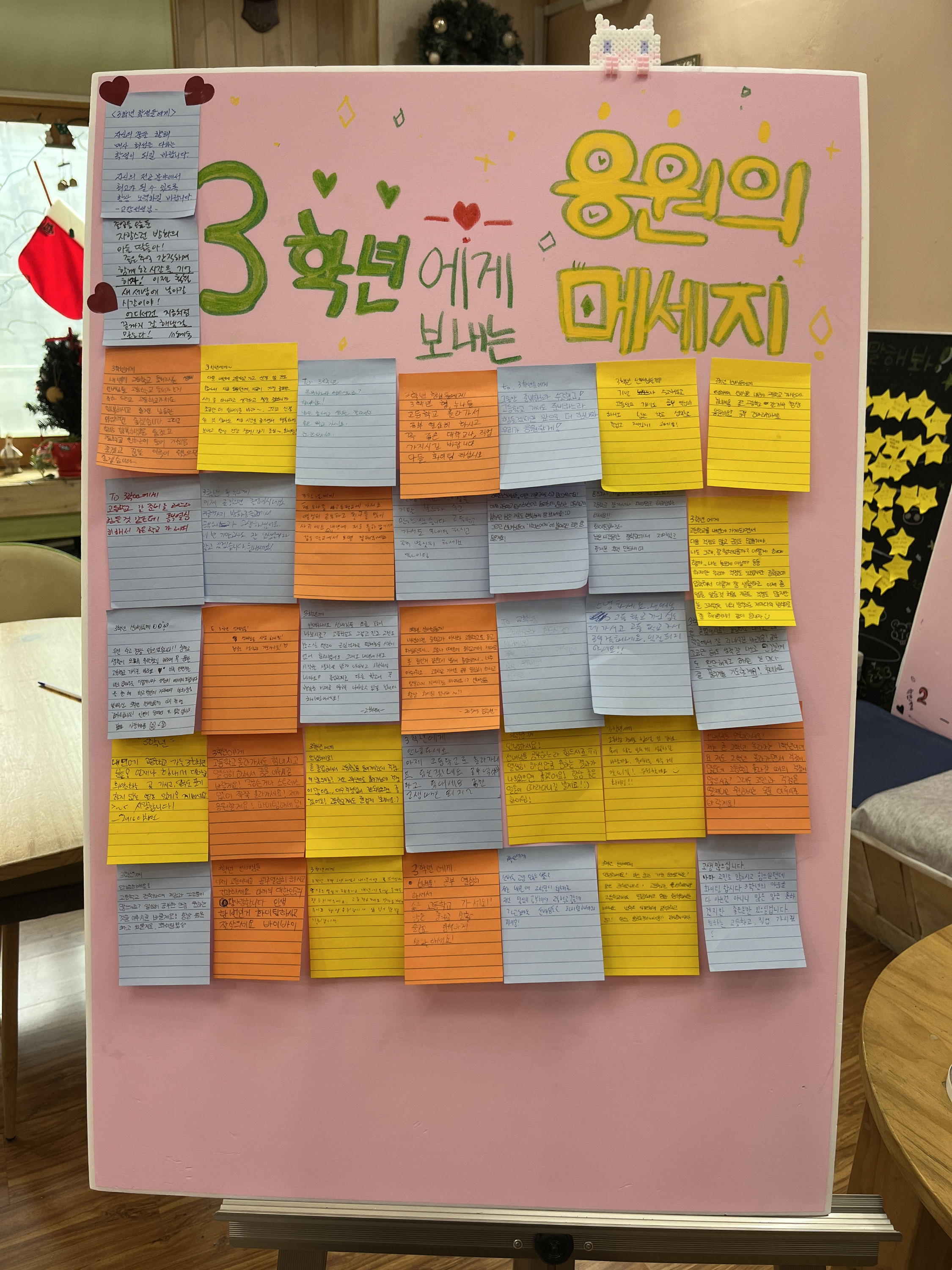 -생각보다 훨씬 많이 응원과 격려의 포스트잇 글들이 붙어있어서 놀랐고 대부분 1학년때 많이 놀아두라는 형식의 글들인거 같아서 웃겼다. 이렇게 많이 남겨주신 선배들께 고마웠고 다음에도 이런 이벤트를 하면 나도 참여해야겠다는 생각이 들었다.