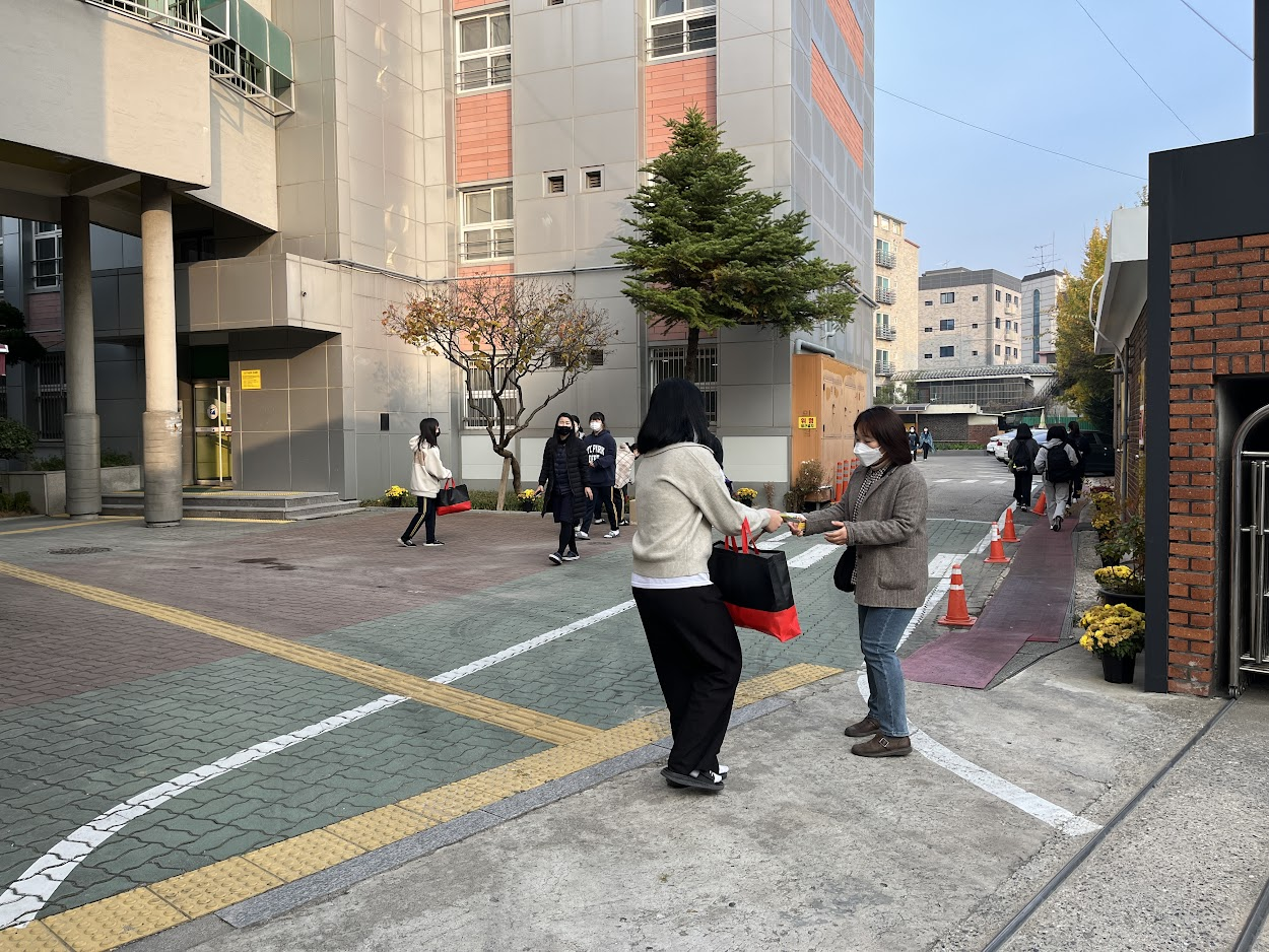 ① 등굣길에 간식꾸러미를 건네며 응원을 전하는 캠페인