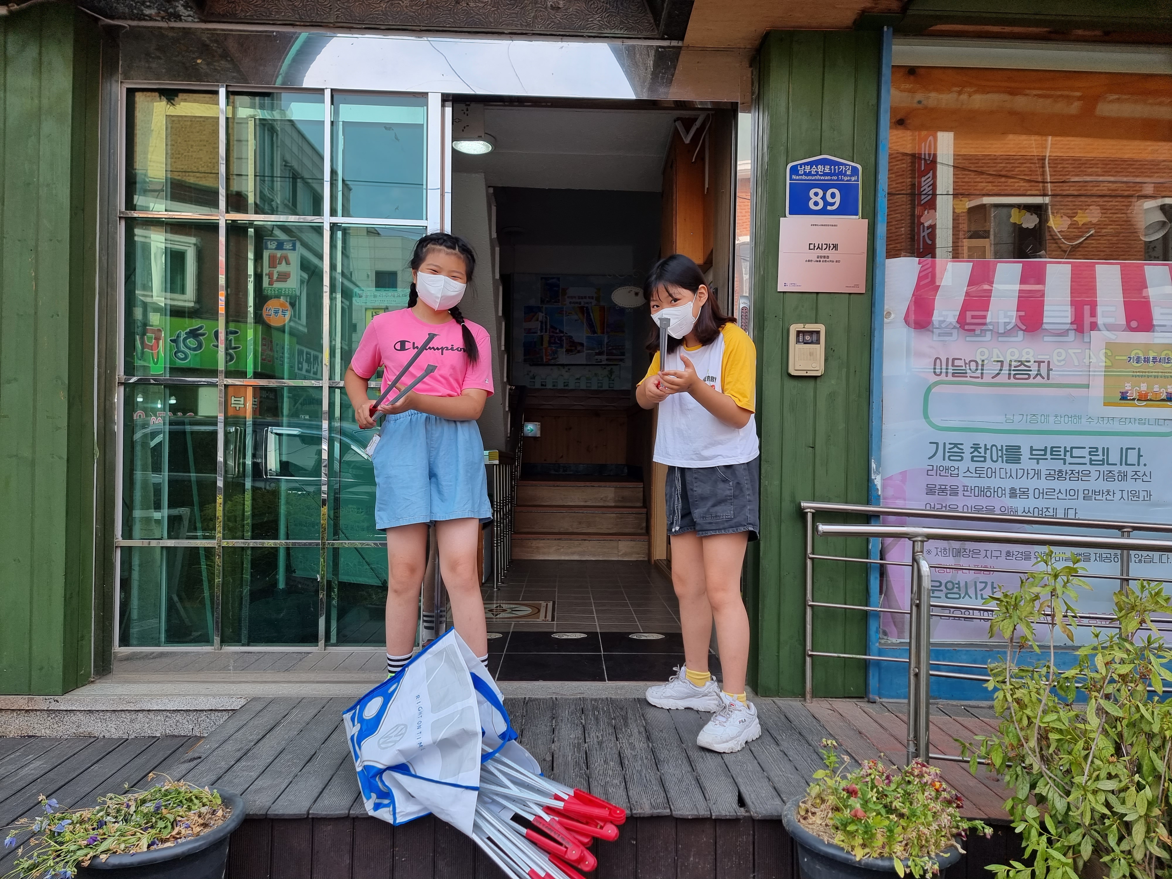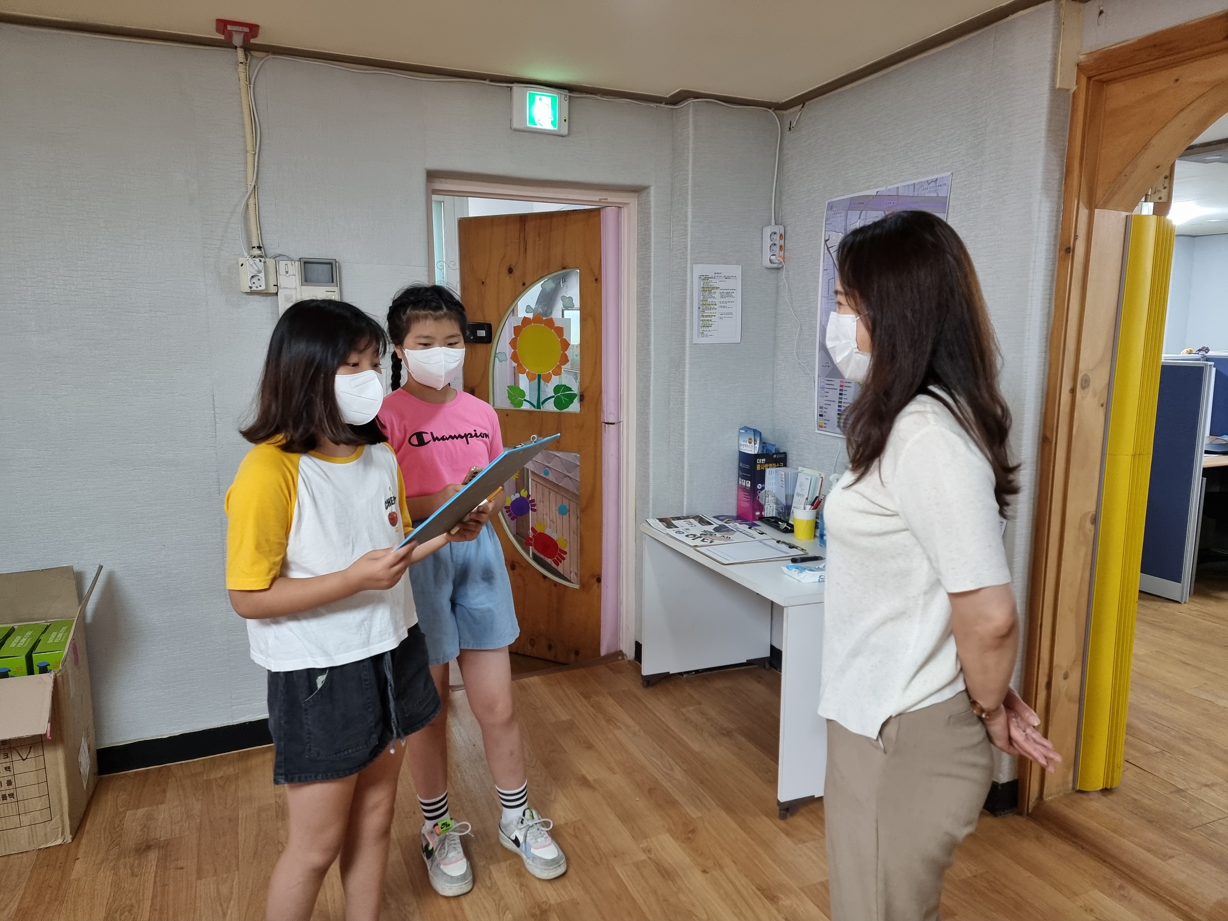 환경동아리 모임 하루 전날 월요일, 공항동도시재생센터에서 집게를 빌리기로 한 희연이와 연서를 장미공원에서 만났습니다. 집게를 빌리기 위해 어떻게 말씀드리면 좋을지 직접 대본을 썼습니다.