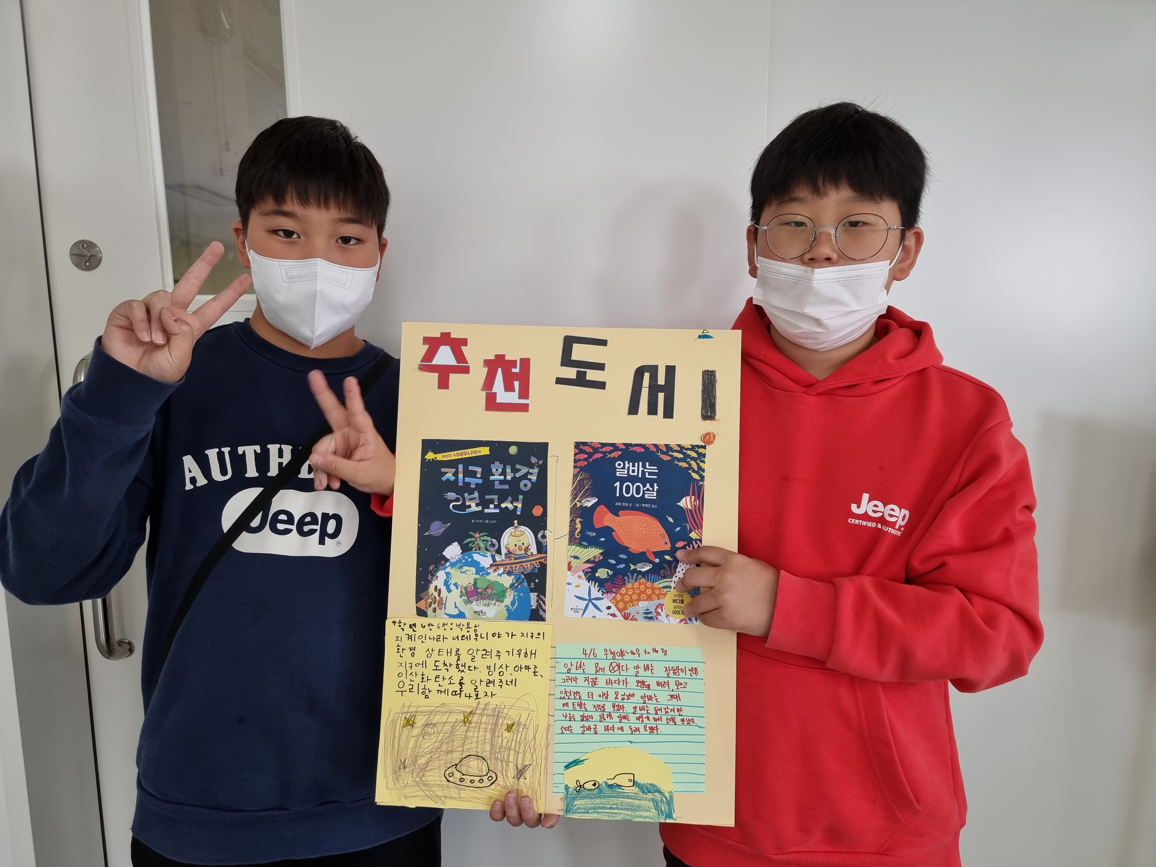 이 내용을 학교 복도에 전시하기로 했습니다. 아이들이 직접 읽고 쓴 글을 소개하니 스스로 뿌듯하게 생각할 겁니다. 오가는 아이들도 환경에 더욱 관심 갖고 추천 도서를 읽으면 좋겠습니다. 아이들이 쓴 글을 아래에 소개합니다.
