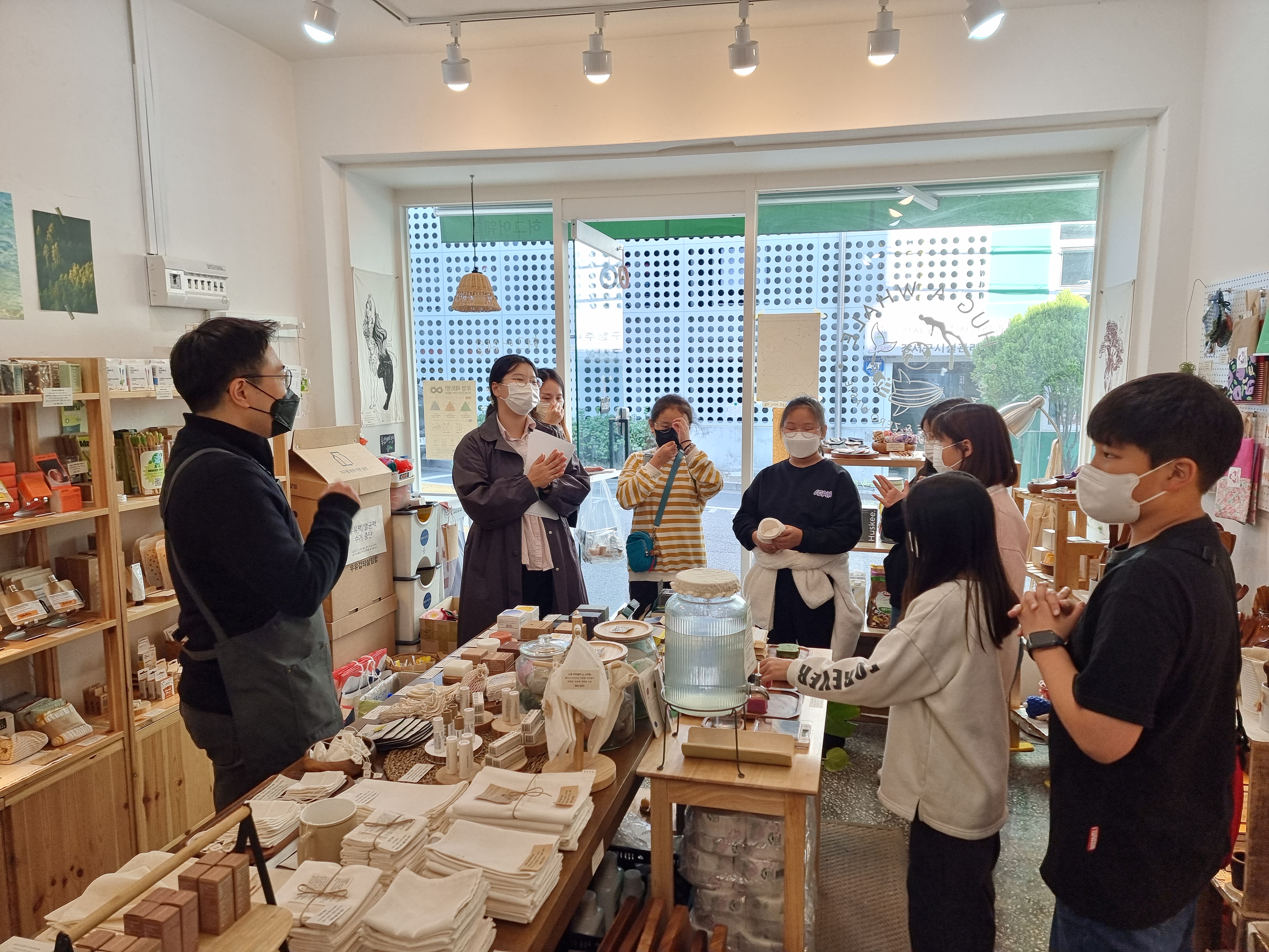 사장님께서 제로웨이스트샵을 설명해주셨습니다. 지금 우리 환경이 어떤 상태인지, 환경을 지키기 위해 해야 할 일이 무엇인지, 환경과 관련한 물품이 무엇인지, 일회용품과 과대포장을 하지 않아야 하는 이유가 무엇인지, 적게 사고 적게 버려야 하는 이유가 무엇인지 알려주셨습니다.