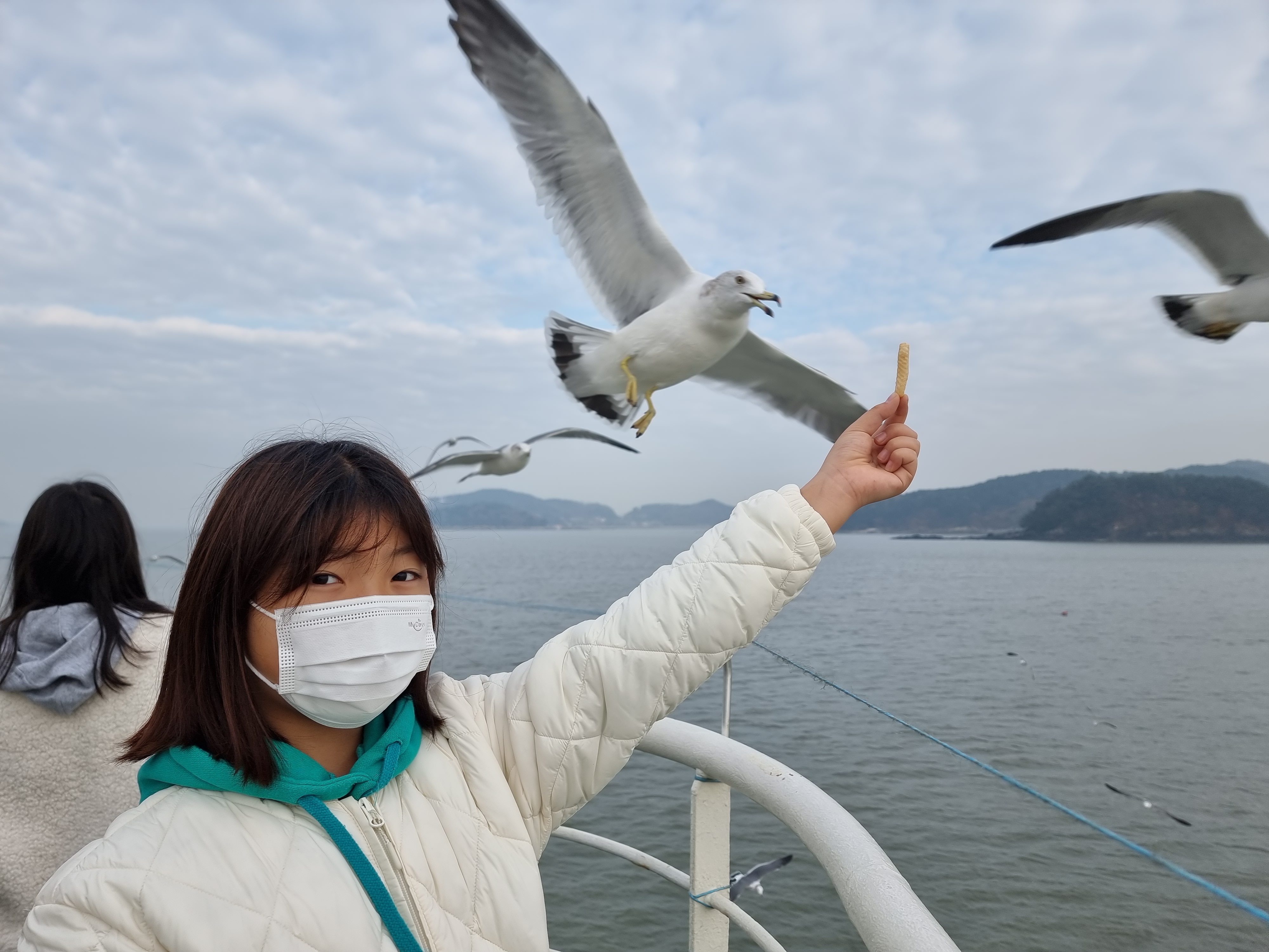 배를 탔습니다. 갈매기가 우리를 맞아줍니다. 각자 가져온 새우깡을 갈매기에게 던져주었습니다. 점점 용기가 생긴 아이들은 새우깡을 들고 하늘 높이 손을 올렸습니다. 갈매기가 순식간에 과자를 낚아채 갔습니다. 환호를 질렀습니다. 시원한 바닷바람을 맞으며 시간 가는 줄 모르고 놀았습니다. 때마침 흐리다는 날씨 예보와 달리 하늘도 파랗게 맑았습니다.