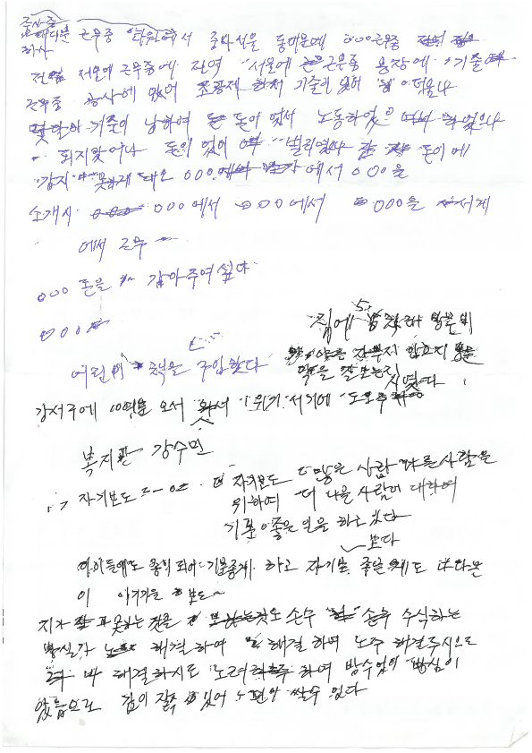 편지 내용 본문 군 생활 중에 세계 평화를 위해 하사, 중사로 전역한 후 공장에서 일했습니다. 돈이 없어 노동하였으나 돈은 많이 벌지도 받지도 못했습니다. 돈이 없어 빌렸으나, 갚지 못하게 되었습니다. 현지까지 갚지 못하던 중이라 복지관 강수민에게 가게 되었습니다. 저를 알게 되었습니다. 저를 위하여 여러 곳에 소개시켜줬습니다. 제가 살 수 있게 해주었습니다. 제가 살 수 있는 방법이 한가지 있습니다. 저를 대신하여 가고 있습니다. 이 말을 꼭 하고 싶습니다. 강수민 같은 사람이 많아져 생활이 좋아지길 바랍니다. 사람들이 좋은 사람, 좋은 인생 살게 해 주시기 바랍니다. 강수민 양 같은 사람이 많을수록 좋은 세상, 나라가 되리라 믿고 있습니다. 세상이 강수민 양이 있기를 바랍니다. 관장님(대표님) 응원합니다. 강수민 양을 잊지 마십시오. 감사합니다. |