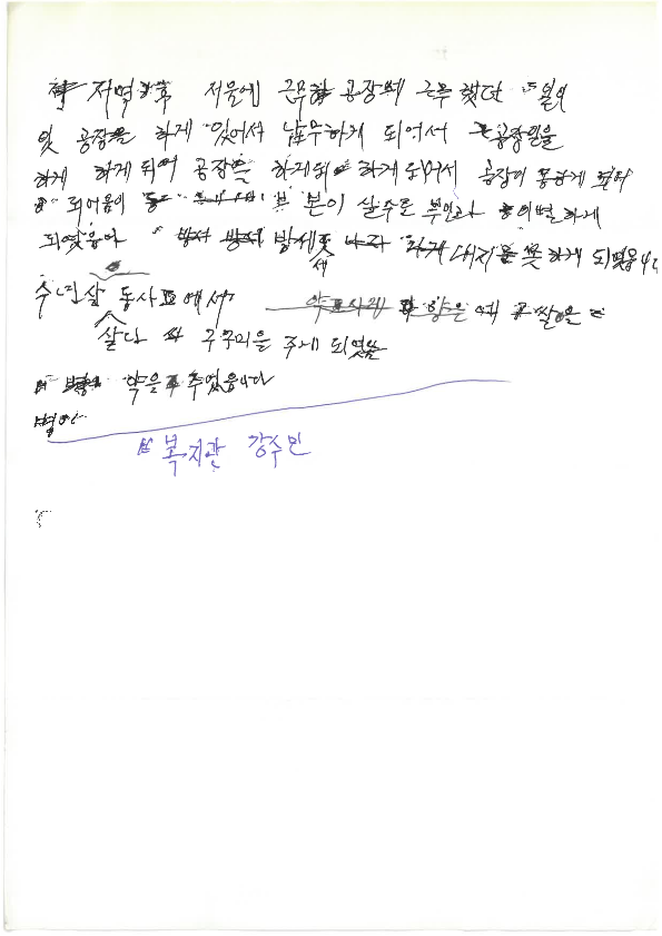 | 편지 내용 본문 군 생활 중에 세계 평화를 위해 하사, 중사로 전역한 후 공장에서 일했습니다. 돈이 없어 노동하였으나 돈은 많이 벌지도 받지도 못했습니다. 돈이 없어 빌렸으나, 갚지 못하게 되었습니다. 현지까지 갚지 못하던 중이라 복지관 강수민에게 가게 되었습니다. 저를 알게 되었습니다. 저를 위하여 여러 곳에 소개시켜줬습니다. 제가 살 수 있게 해주었습니다. 제가 살 수 있는 방법이 한가지 있습니다. 저를 대신하여 가고 있습니다. 이 말을 꼭 하고 싶습니다. 강수민 같은 사람이 많아져 생활이 좋아지길 바랍니다. 사람들이 좋은 사람, 좋은 인생 살게 해 주시기 바랍니다. 강수민 양 같은 사람이 많을수록 좋은 세상, 나라가 되리라 믿고 있습니다. 세상이 강수민 양이 있기를 바랍니다. 관장님(대표님) 응원합니다. 강수민 양을 잊지 마십시오. 감사합니다. |