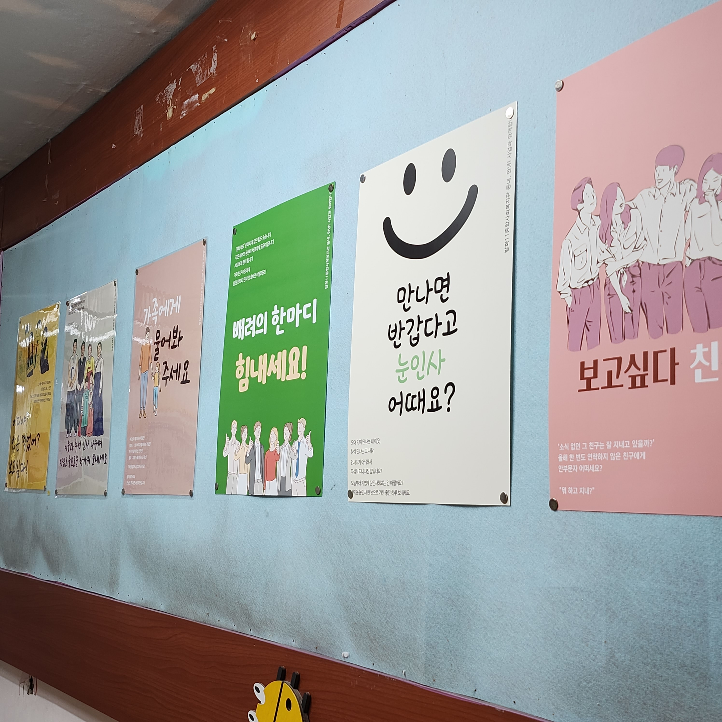 이전에 부착한 인사캠페인 포스터를 한쪽 벽면에 쫙 붙여 놓은 가게들이 많습니다. 곁에있기1팀 지역에 있는 상가 사장님들께서 인사캠페인 포스터를 참 좋아해 주신 덕분입니다.
