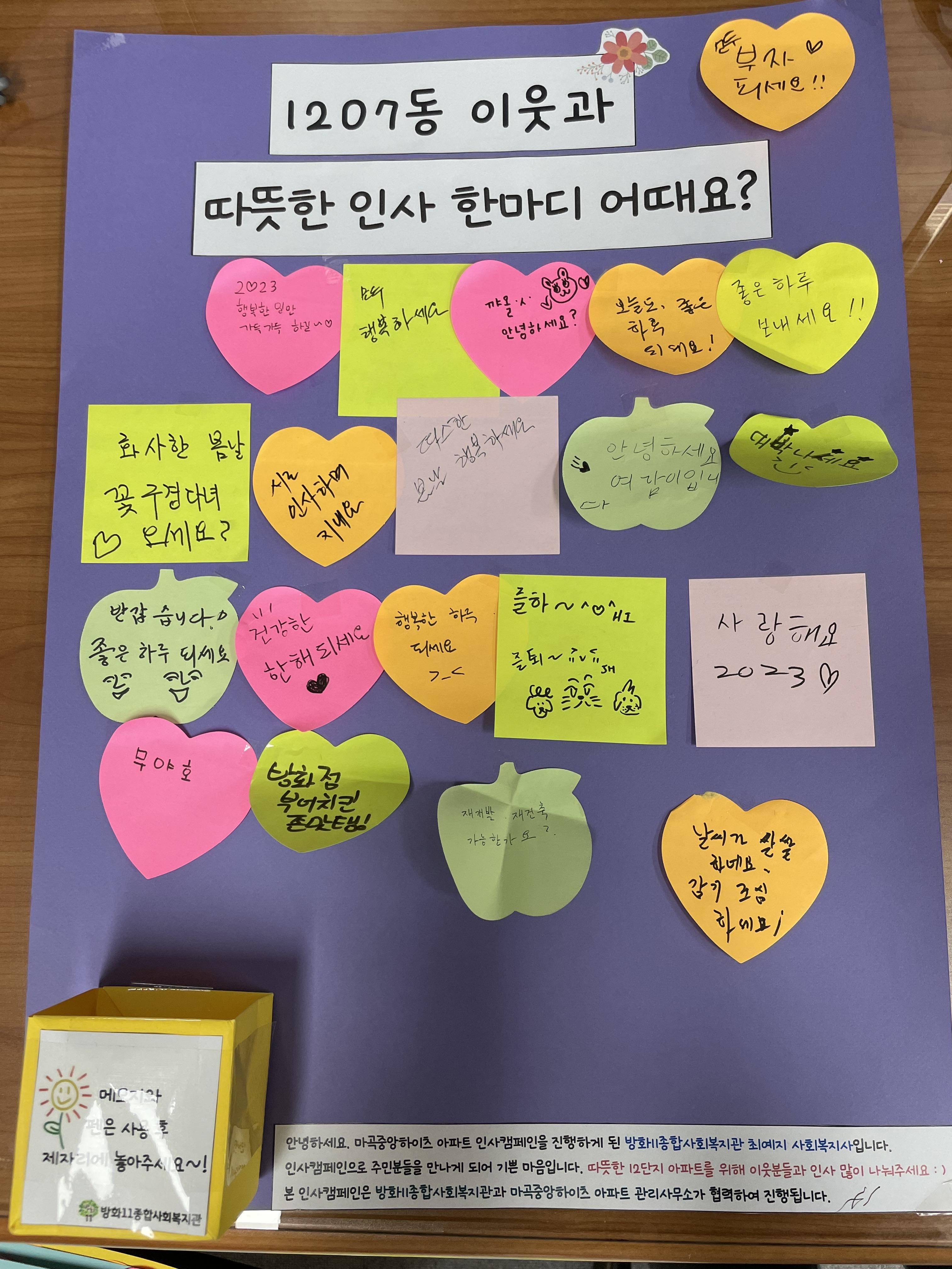 작년에 마곡중앙하이츠 아파트에서 붙임쪽지를 구실로 이웃과 인사 나누는 캠페인을 진행한 적 있습니다.
