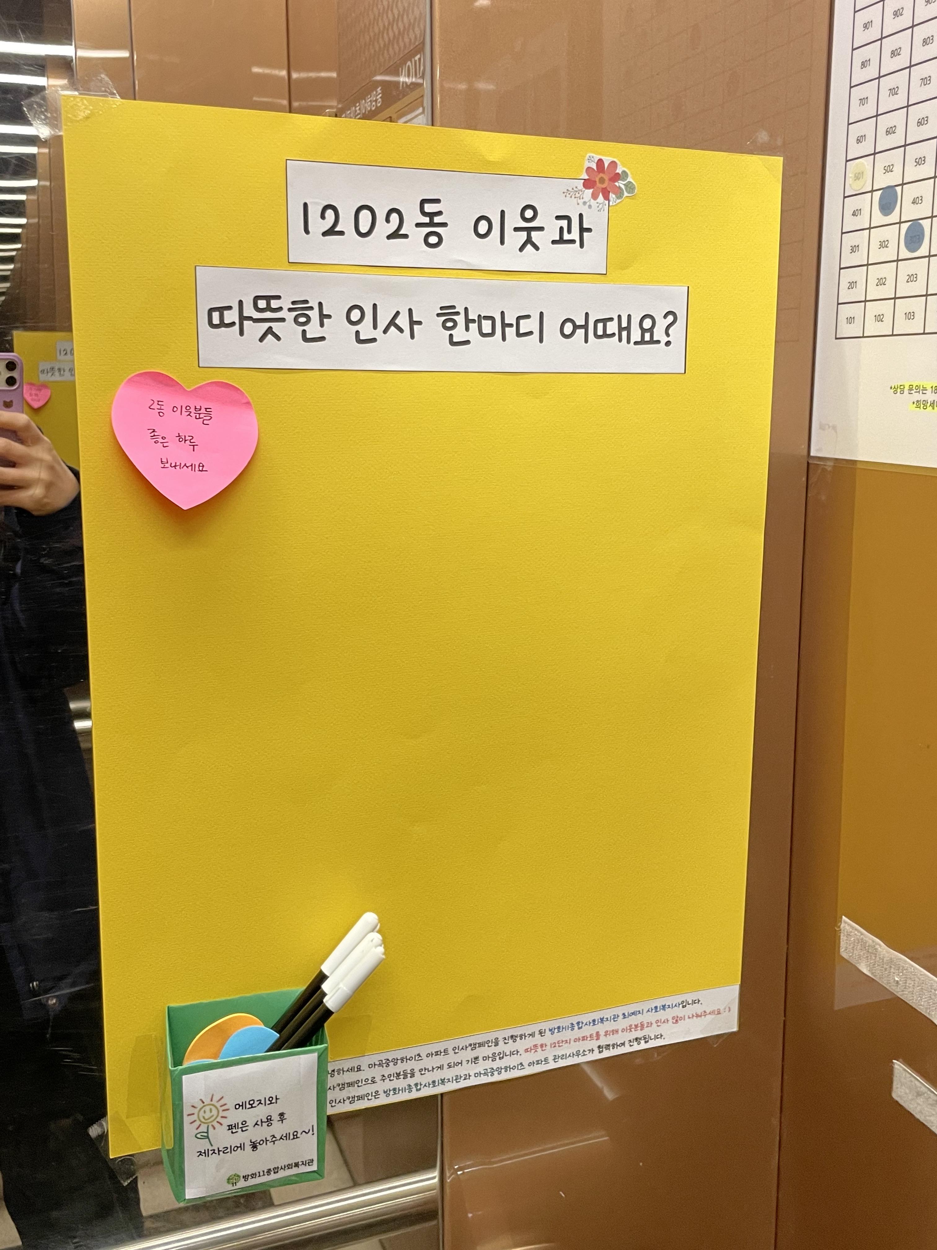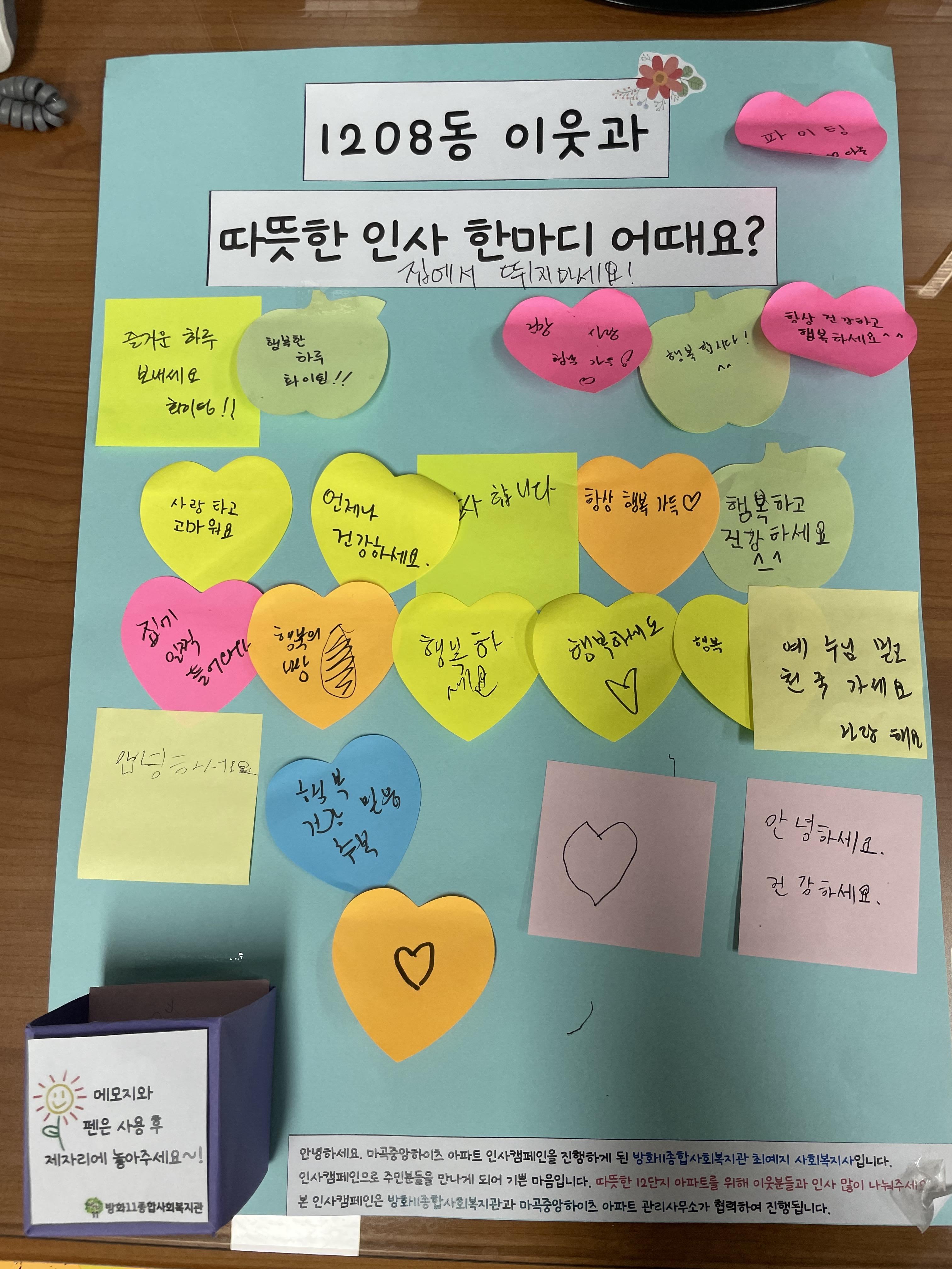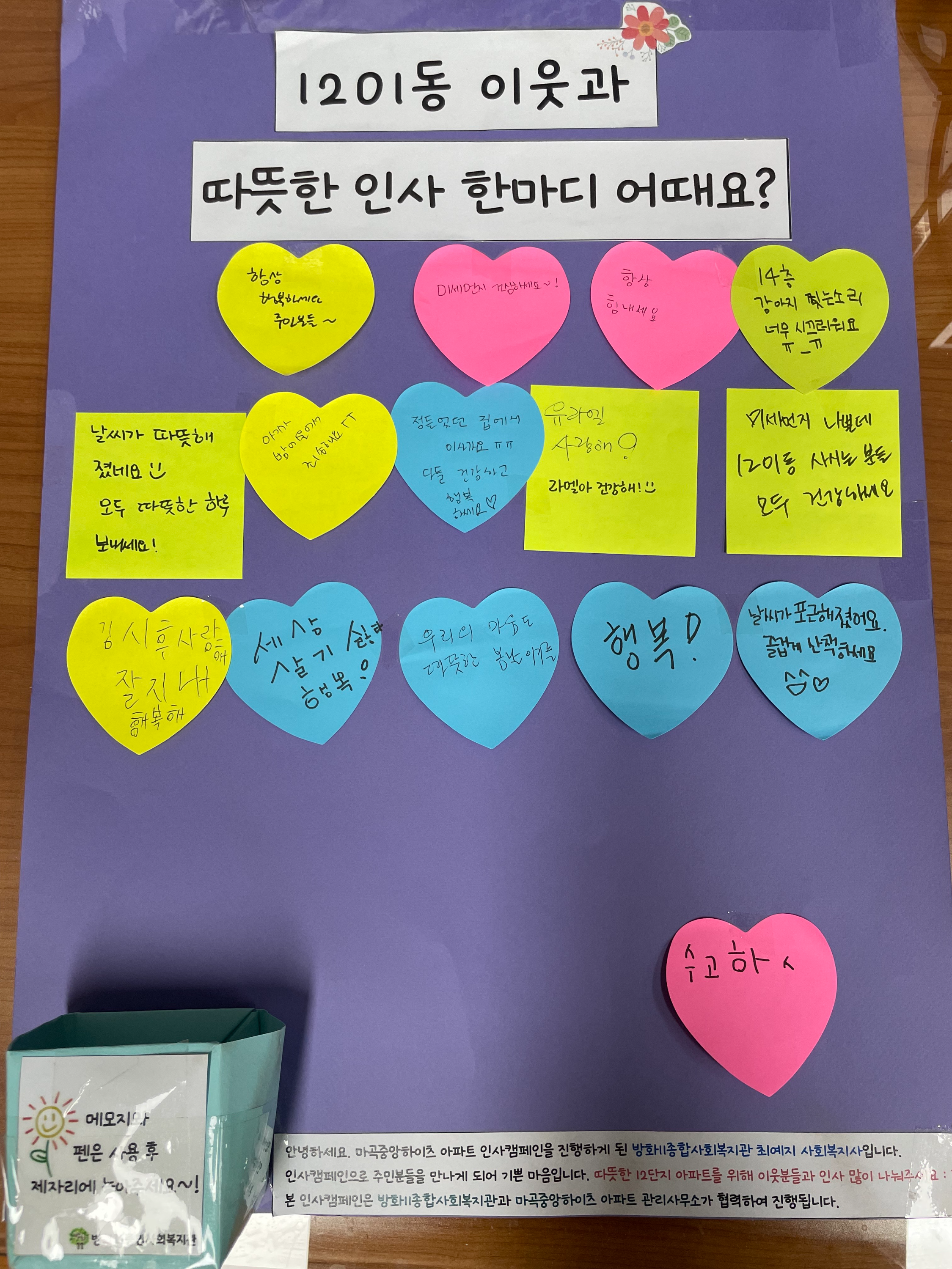 같은 동에 사는 이웃과 인사를 제안하는 문구로 붙임쪽지판을 제작했습니다.