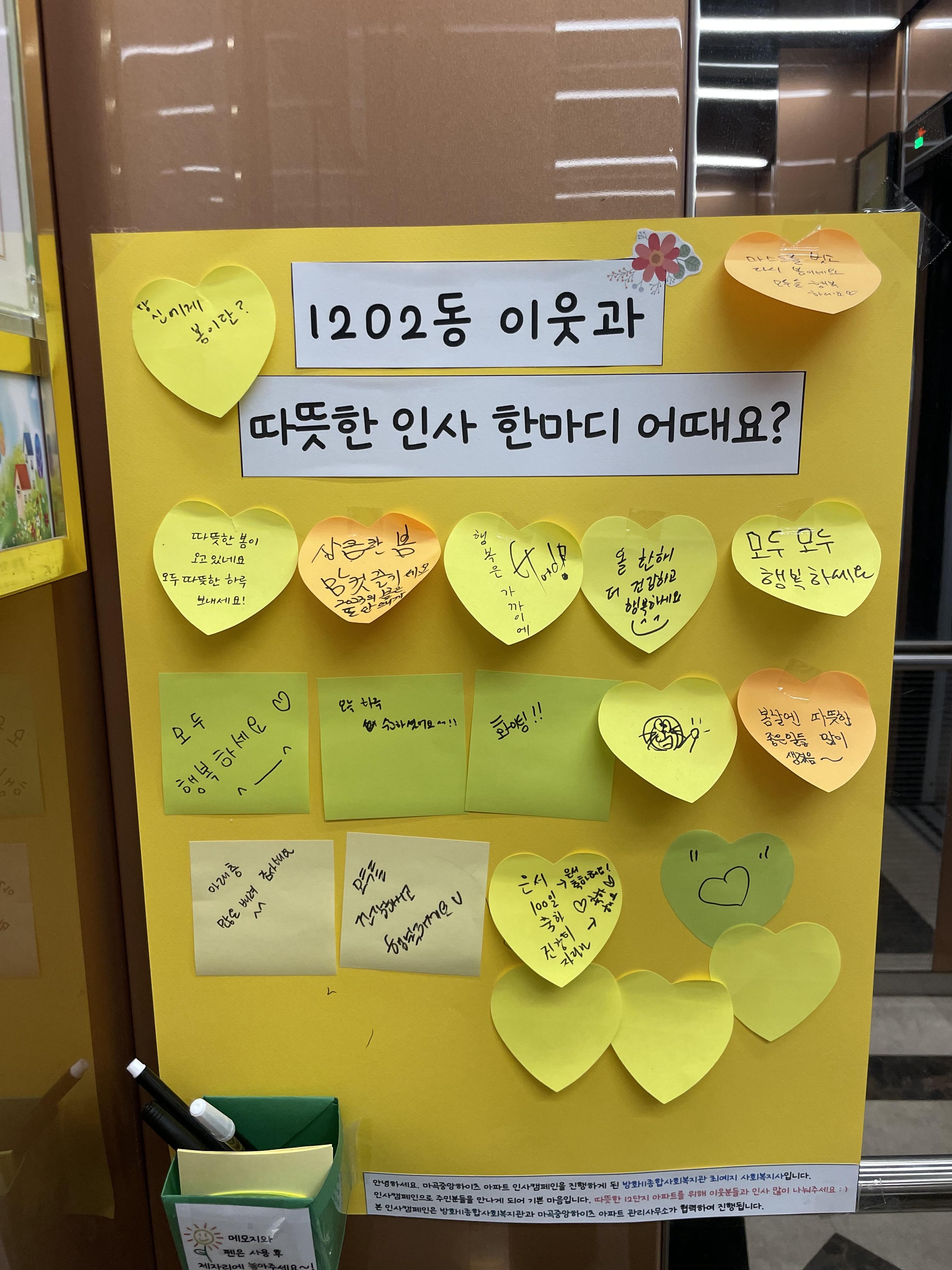 | "좋죠~ 복지관에서 항상 이렇게 나서서 해주시더라고요. 나중에 아이들 하원 시키고 저도 참여할게요." "저는 솔직하게 새벽 일찍 출근해서 옆집에 누가 사는지도 몰라요. 이렇게 이웃이랑 인사 나누면 좋지요~" "(붙임쪽지판을 보고) 이게 뭔가 했어요. 관리사무소에서 했나~ 관리사무소 소장님께 감사하다고 써 붙일까 고민했어요." "인사 쪽지 남겼어요. 작년에도 인사캠페인 하는 거 본 적 있어요. 화사하고 참 좋네요." "인사 쪽지 보니까 너무 좋았어요. 엘리베이터가 화사해지고. 참여는 안 했는데 다음에 시간 될 때 남겨볼게요." "쪽지는 안 남겼는데 보니까 마음이 따뜻해지고 좋았어요." "이 인사를 다 주민들이 쓴 건가요? 몰랐네요. 나중에 참여할게요." "정겹죠~ 이게 사람 사는 세상이죠." "어제 쪽지 남겼어요. 아침에 출근할 때 보면 기분 좋고 그렇더라고요." |
