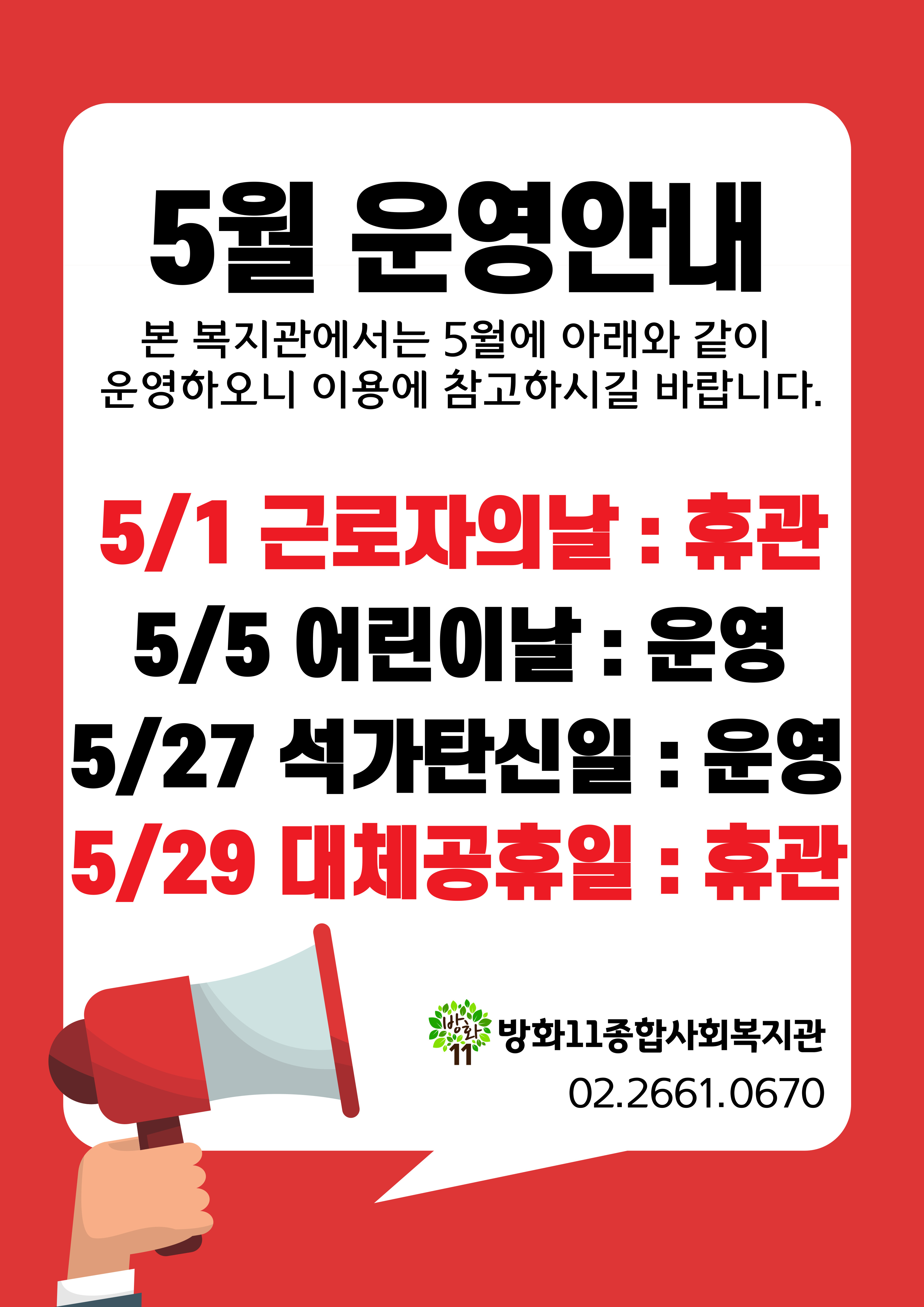 방화11종합사회복지관 5월 운영안내