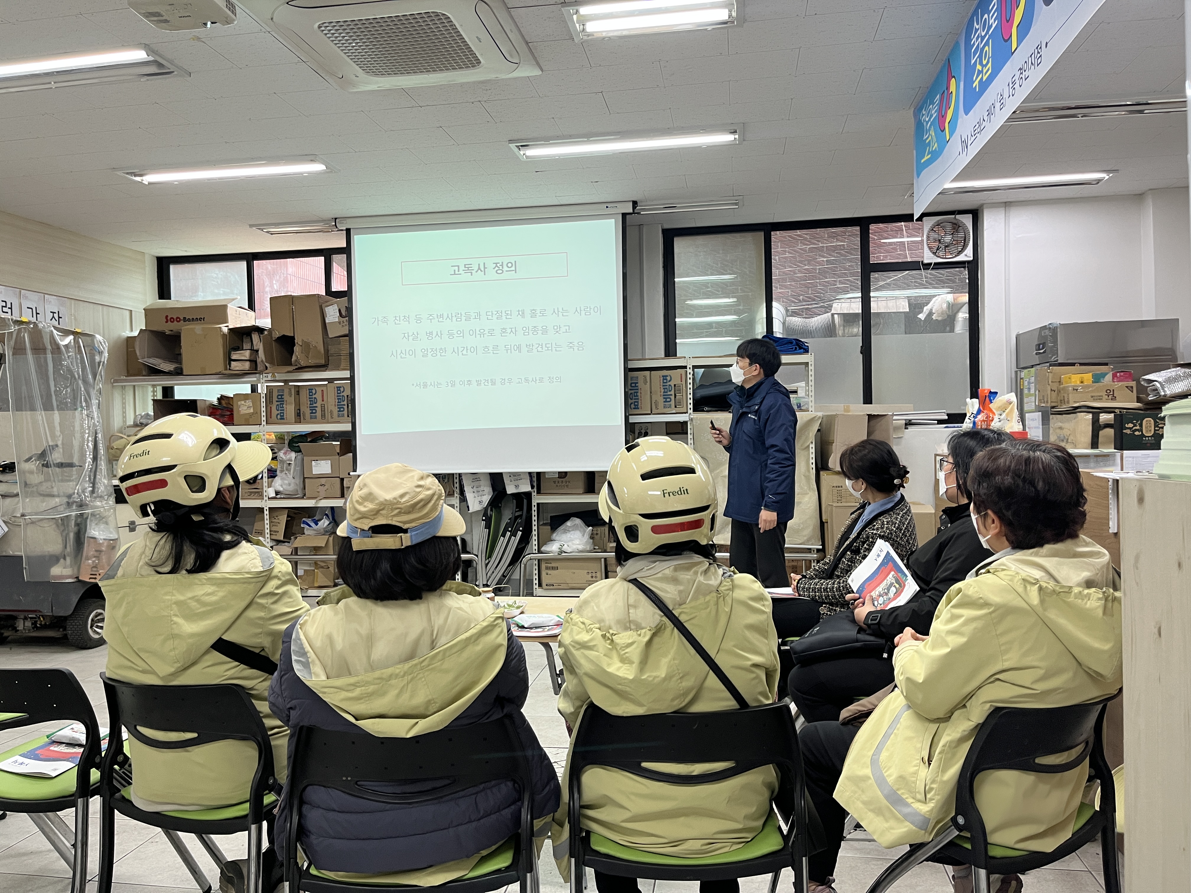 짧은 인사를 시작으로 회의를 시작했습니다. 먼저 사회적 고립가구 협력주민 교육을 진행했습니다.