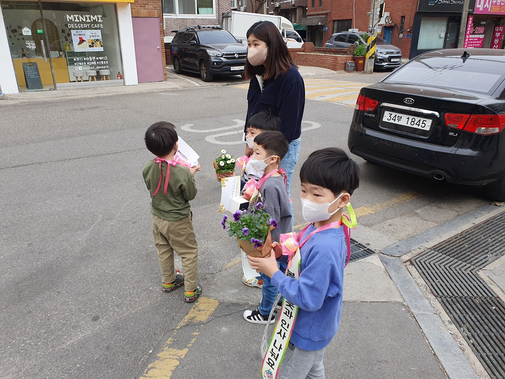 1. 아이들이 인사캠페인 엽서를 정성스럽게 준비해줬어요. 아이들의 준비 과정 이야기를 들려주세요! - 우리주변 이웃에게 봄이 왔음을 전달해보자고 제안하자 유아들이 의견을 주었습니다. - 작년에도 편지 써본 경험이 있는 친구들이여서, 이웃들에게 봄을 맞이하여 편지를 써보자고 얘기했더니 적극적으로 참여했어요!! - 6세, 7세 유아들이 이웃, 계절 봄에 관한 이야기나누기 한 후 이웃과 봄을 함께 나누기로 하였습니다 2. 인사캠페인을 진행하는 과정에서 아이들이 해준 말이 있었나요? - 여러분 봄이왔어요! 이웃에게 인사해요! 할머니할아버지 사랑해요! - 선물받는 걸 좋아하는 친구들인데 '선물을 주니까 더 좋아요!'라고 얘기하는 친구들이 있었습니다! 3. 봄인사 거리 캠페인이 교육적으로 어떤 효과가 있었나요? - 우리이웃을 한번 더 생각해보는 시간을 가지게 된 것같습니다. - 이웃에게 나눔하며 보람된 마음을 가질 수 있었습니다. - 유아들이 자신과 자신이 살고있는 사회나 세상에 관심을갖고, 꽃이라는 매체를 통해 다른사람과 더불어 살아가는 방법으로 인사 나누기가 필요하다는 것을 경험할 수 있는 의미있는 활동이었다고 생각합니다. 4. 캠페인 이후에 아이들에게 어떤 변화가 있었나요? - 바깥놀이를 나갈때에도 우리주변이웃에게 인사하는 모습을 보였습니다. - 주변 이웃들에게 먼저 인사하는 친구들이 많아 졌어요! 5. 인사캠페인을 지속적으로 하는 것이 아이들에게 도움이 될까요? - 네 많은 도움이 될 것같아요! - 유아기에는 가치관이 형성되는 시기이므로 일상생활에서의 지속적인 활동은 긍정적인 영향이 있을것으로 생각합니다. |