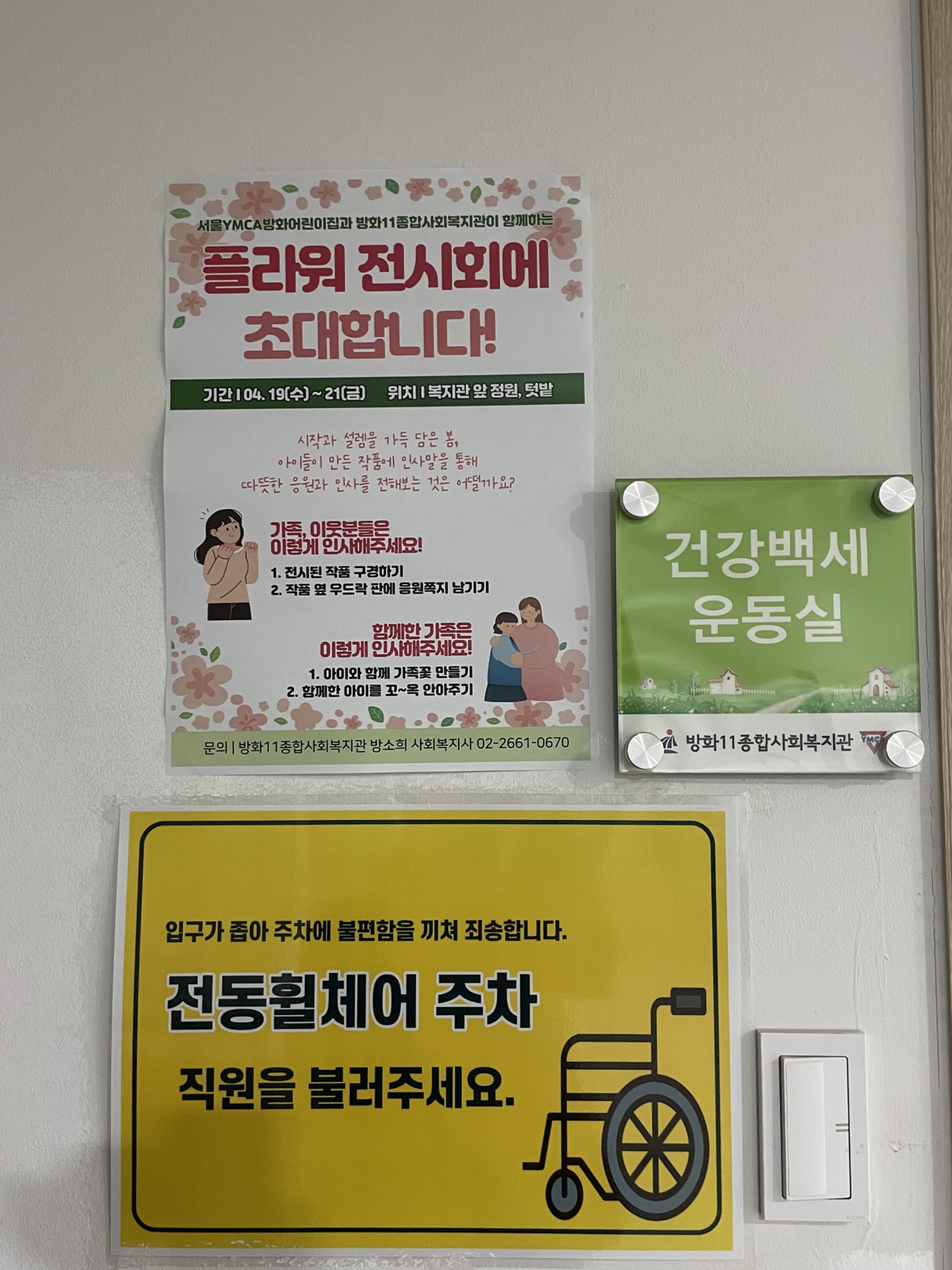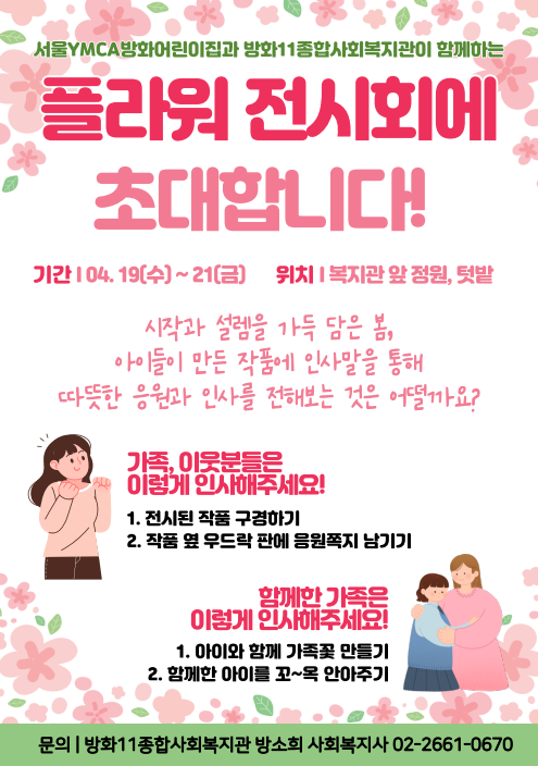 방화어린이집 추수진 원장님을 뵙고 인사를 나눴습니다. 4월 인사캠페인 준비는 복지관 일정이 바쁘게 진행되면서 원장님께서 구체적인 내용을 궁리해주셨습니다. 원장님은 아이들이 꽃을 활용하여 작품을 만드는 플라워 전시회 행사를 진행할 예정이라고 하셨습니다. 아이들이 만든 꽃을 보며 가족, 지역 주민분들이 응원 인사말을 건네면 어린이집 행사와 협력하면서, 복지관에서 전하고자 하는 메시지를 잘 전달할 수 있겠다 싶었습니다.