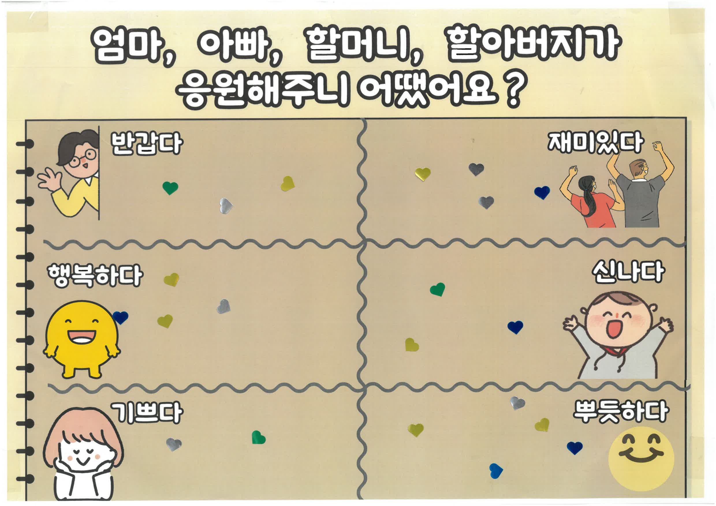 | 1. 응원 인사말을 나누어보니 어떤 기분이 드셨나요? - 자주 볼 일이 없어서 서먹했던 인사를 이렇게라도 나누니 이웃의 웃는 모습을 보네요. - 작년에도 비슷한 캠페인을 진행했던 것 같은데, 늘 신경써주셔서 할 때마다 기분이 좋아요. - 여러 사람이 오고가며 왔다갔다 하니 좋았습니다. - 아이들과 선생님께서 정성껏 준비한 전시를 볼 수 있고, 쪽지로 마음을 전달하게 되어 가슴이 따뜻해졌습니다. 2. 전시회에서 아이를 응원하고, 안아주고 난 뒤에 가족 간 어떠한 변화가 있었나요? - 서로 더 사랑하지요♡ - 아이가 하원할 때, 볼거리가 있으니 할 말이 많아지는 것 같아요. 이야기 나눌 소재가 있으니 더 이야기를 나누게 되더라고요. - 아이들 작품을 보며 좋았어요. 남편도 퇴근 후에 "전시회 보러가자~"며 말해서 가족과 더 많은 시간을 보낼 수 있었어요. - 아침에 바쁘게 등원 준비하느라 늘 정신없는 아침 시간을 보내는데, 짧게나마 같이 활동하고 마음을 나누니 아이에게도 많은 힘이 된 것 같습니다. 웃으면서 등원했어요. ^^ - 아이가 좋아하니 가족관계가 깊어지는 느낌이 들었어요. 3. 응원의 인사말을 지속해서 하게되면, 아이와 가족에 어떤 것이 좋아질까요? - 자존감 뿜뿜~ 제일 행복한 사람이 되지요. - 아이와 시간을 많이 보내는 게 중요하다고 생각하는데, 아이와의 관계를 형성하는 데에도 좋은 영향을 미치는 것 같아요. - 서로에게 좋은 말들 한 번씩 더 해주면서 관계가 돈독해질 것 같아요. - 요즘 이웃과 지나다니면서도 인사를 잘 하지 않는 삭막한 풍경인데, 아이들이 인사의 중요성을 배울 수 있는 좋은 기회가 될 것 같아요. - 아이가 건강하게 자라는 데에 도움이 될 것 같습니다. |