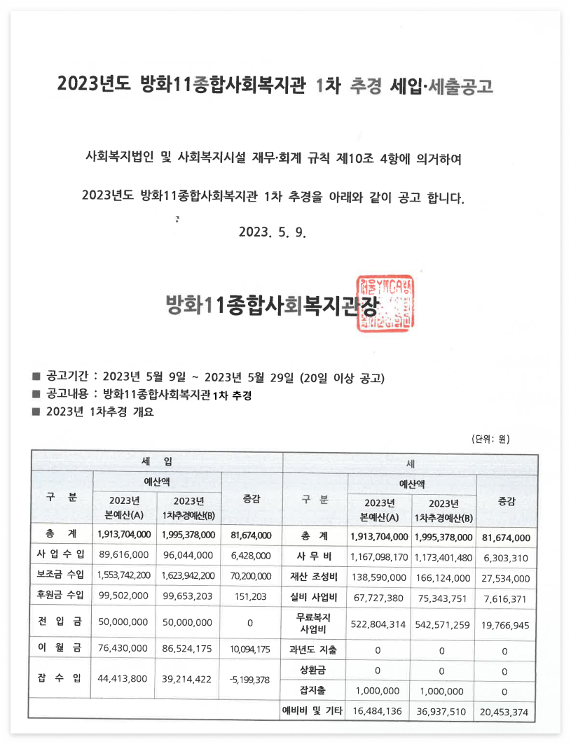 2023년 1차 추경예산공고(장애인주간보호센터햇볕교실) (0) | 2023.05.09 |