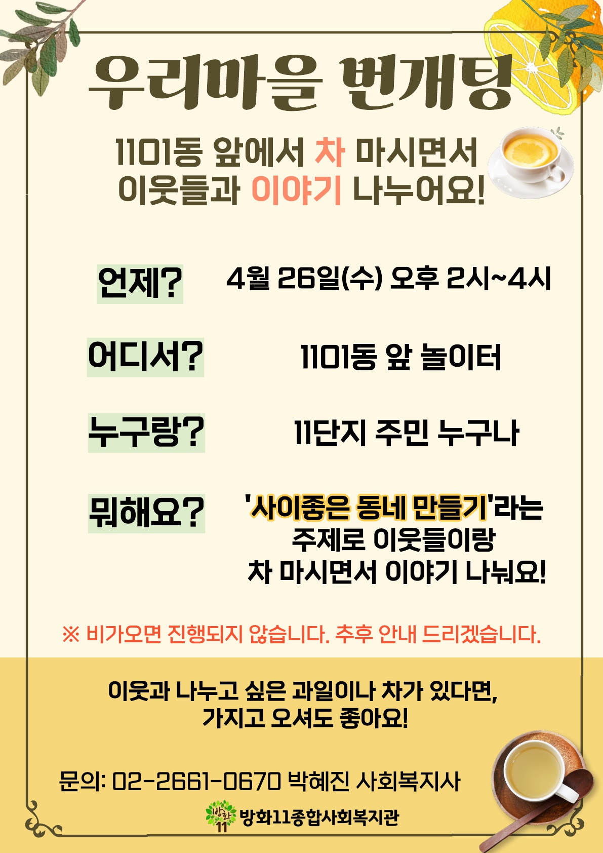 “오늘 1동 앞 놀이터에서 차 마시면서 대화하려고 하는데요, 놀러 오세요!”