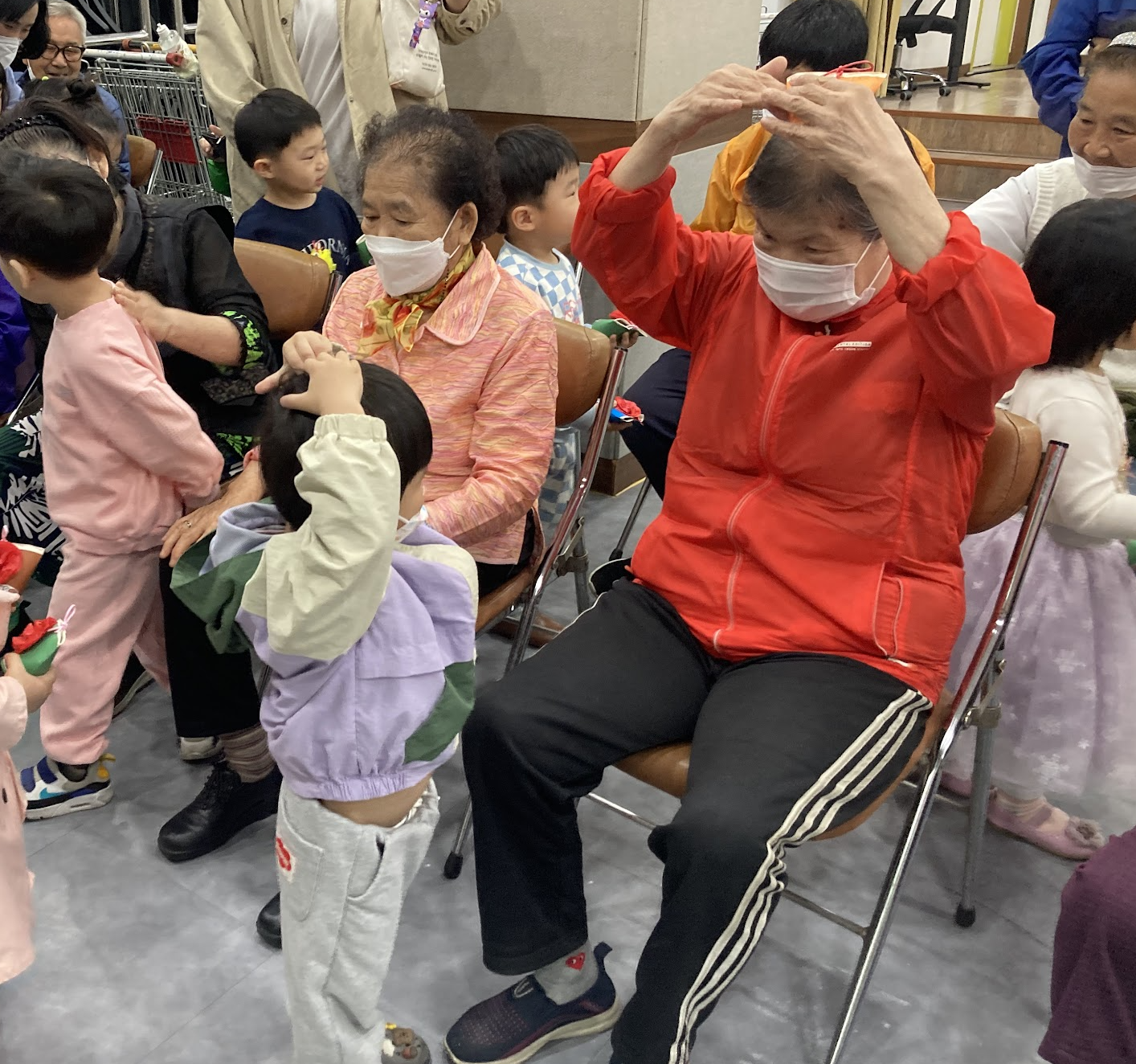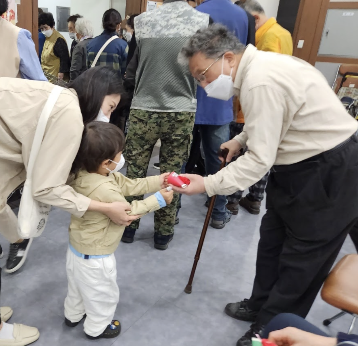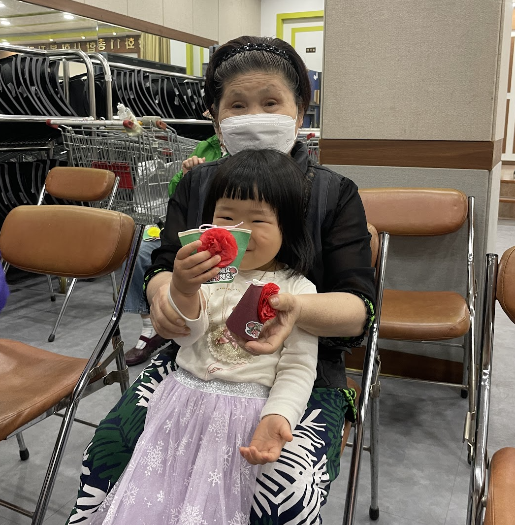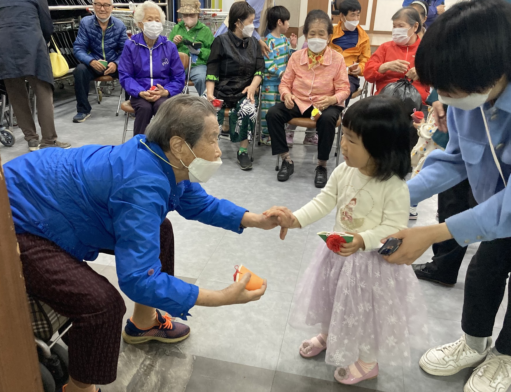 어르신들께 허락을 맡고 아이들이 카네이션 바구니를 들고 한 분 한 분 전달했습니다. “안녕하세요!” 인사하는 아이도 있었고, “사랑해요!” 말하며 손으로 하트를 주고 받는 아이도 있었습니다. 다들 저마다 할 수 있는 방법으로 어르신들과 인사 나눴습니다. 마침 식당 이용 어르신들께 복지관에서 준비한 카네이션 생화와 떡 케이크를 드리며 인사를 나누고 있어, 어버이날 감사 전하는 모습이 더욱 풍성하고 시끌벅적 했습니다.