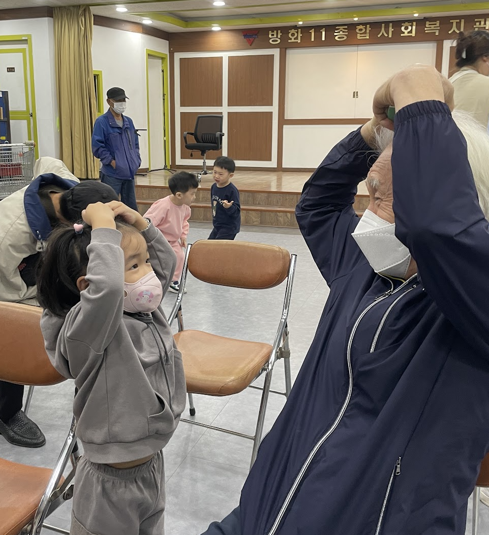 | 1. 가족, 할머니, 할아버지랑 “안녕하세요, 고맙습니다, 사랑해요!” 인사 나누니까 좋았어요? 예(11명) 아니오(3명) 2. 다음 어버이날에도 가족, 할머니, 할아버지랑 인사 나누고 싶어요? 예(11명) 아니오(3명) 3. 어린이집에 올 때 복지관에서 마주치는 할머니, 할아버지랑 인사하고 있어요? 예(10명) 아니오(4명) |