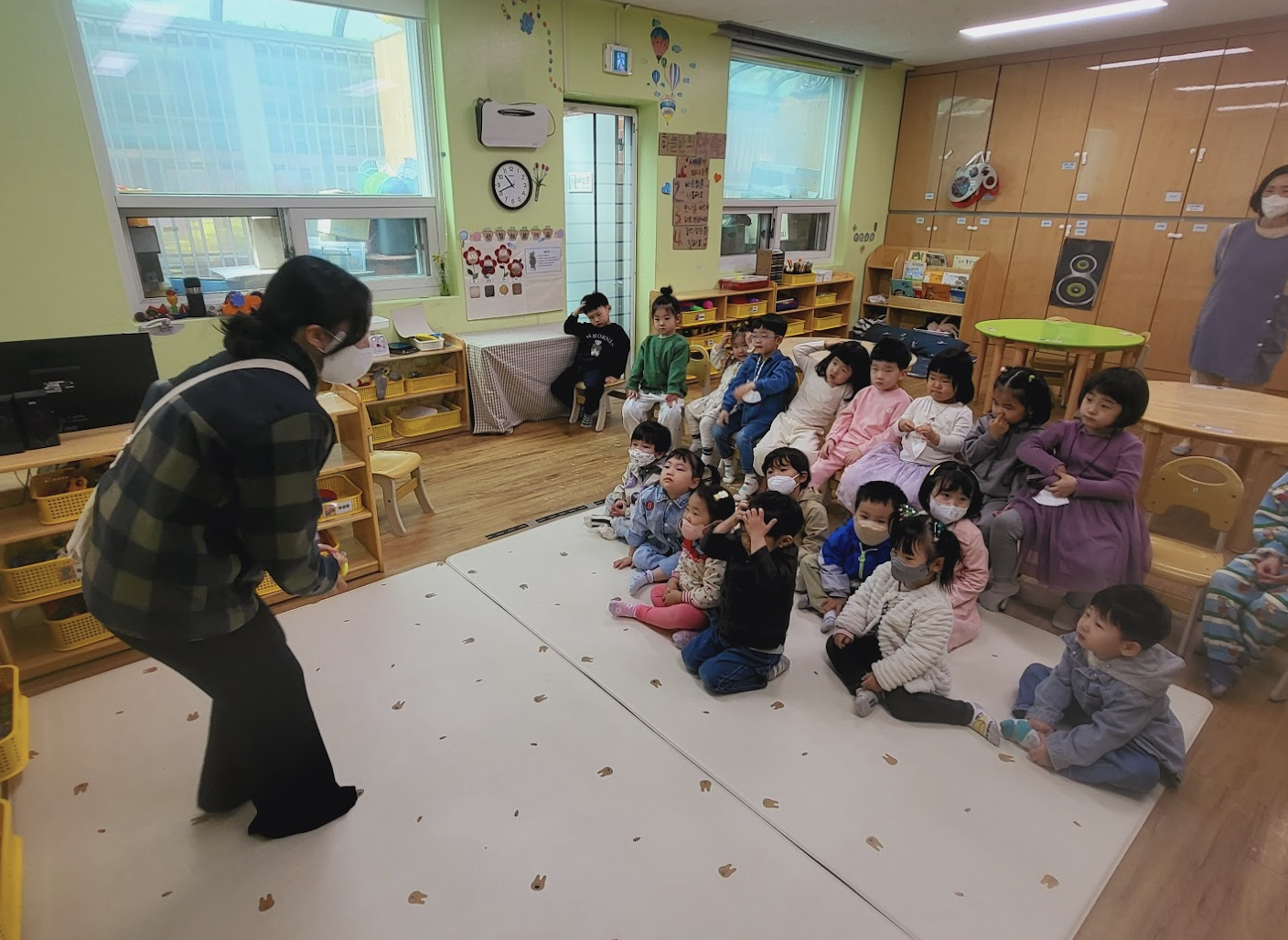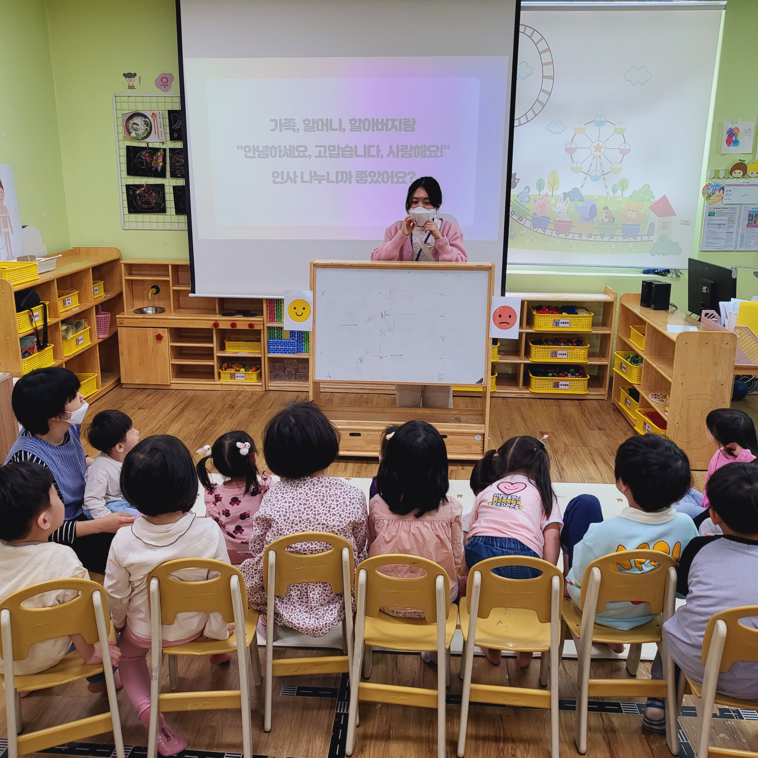 가족 인사캠페인을 마치고, 어르신 인사캠페인이 남았습니다. 아이들이 어르신께 인사드리러 가기 전, 아이들과 함께 인사말을 연습했습니다.