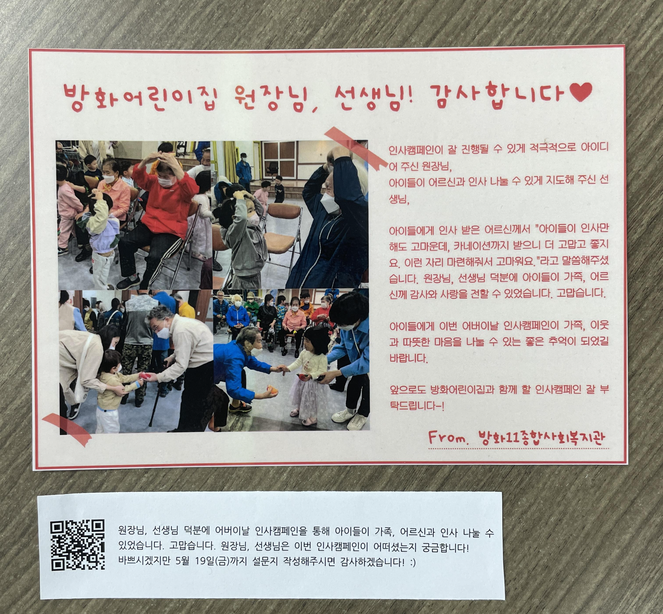 이번 인사캠페인을 통해 방화어린이집 원아 가정에서 애정 감사를 표현하는 시간이 많아지길 소망합니다. 뿐만 아니라 원아가 인사캠페인 때 관계를 쌓았던 지역 어르신들과 인사하며 지내면 좋겠습니다. 이를 바탕으로 마을에서 마주치는 이웃과도 반갑게 인사나눌 수 있는 사람으로 성장하길 바랍니다.