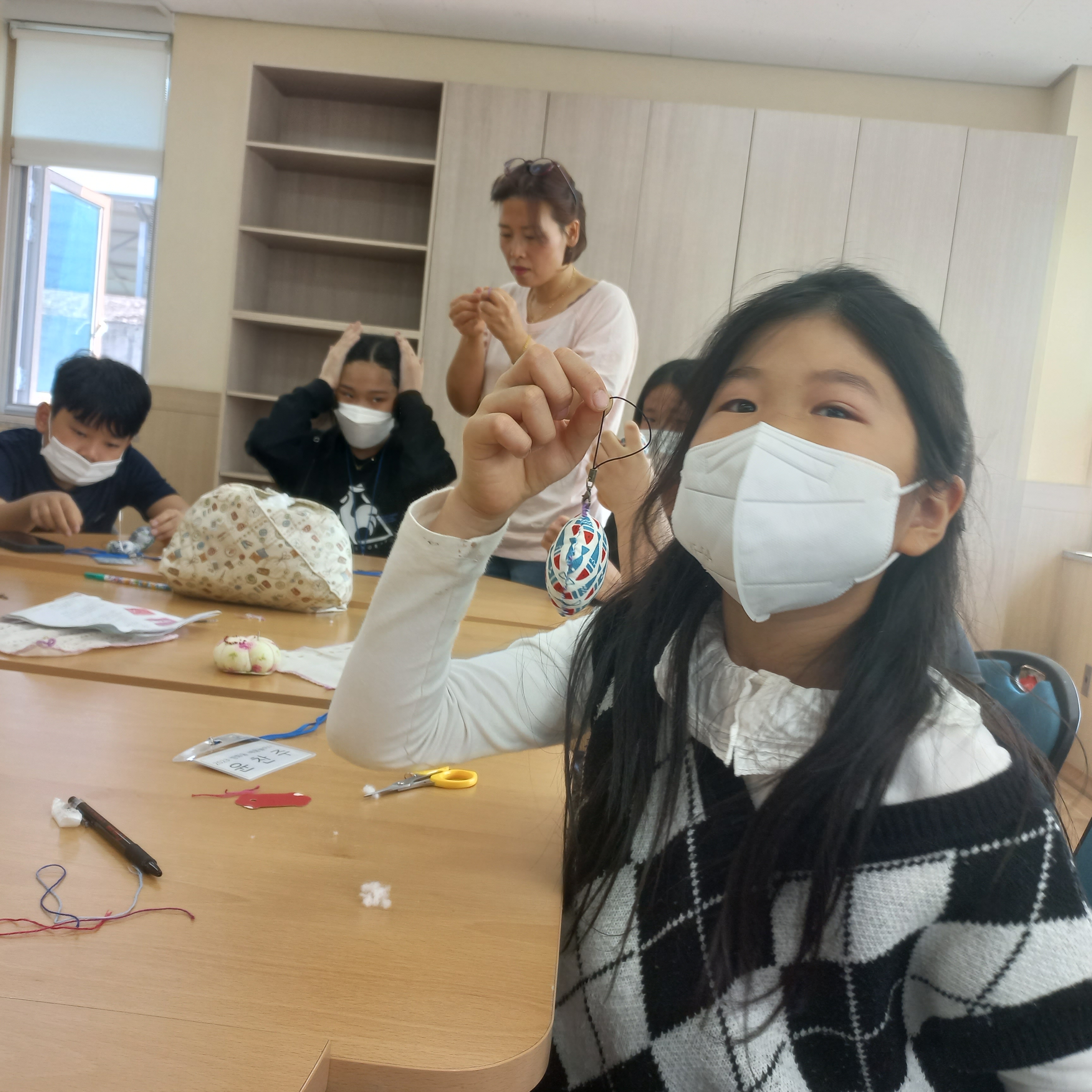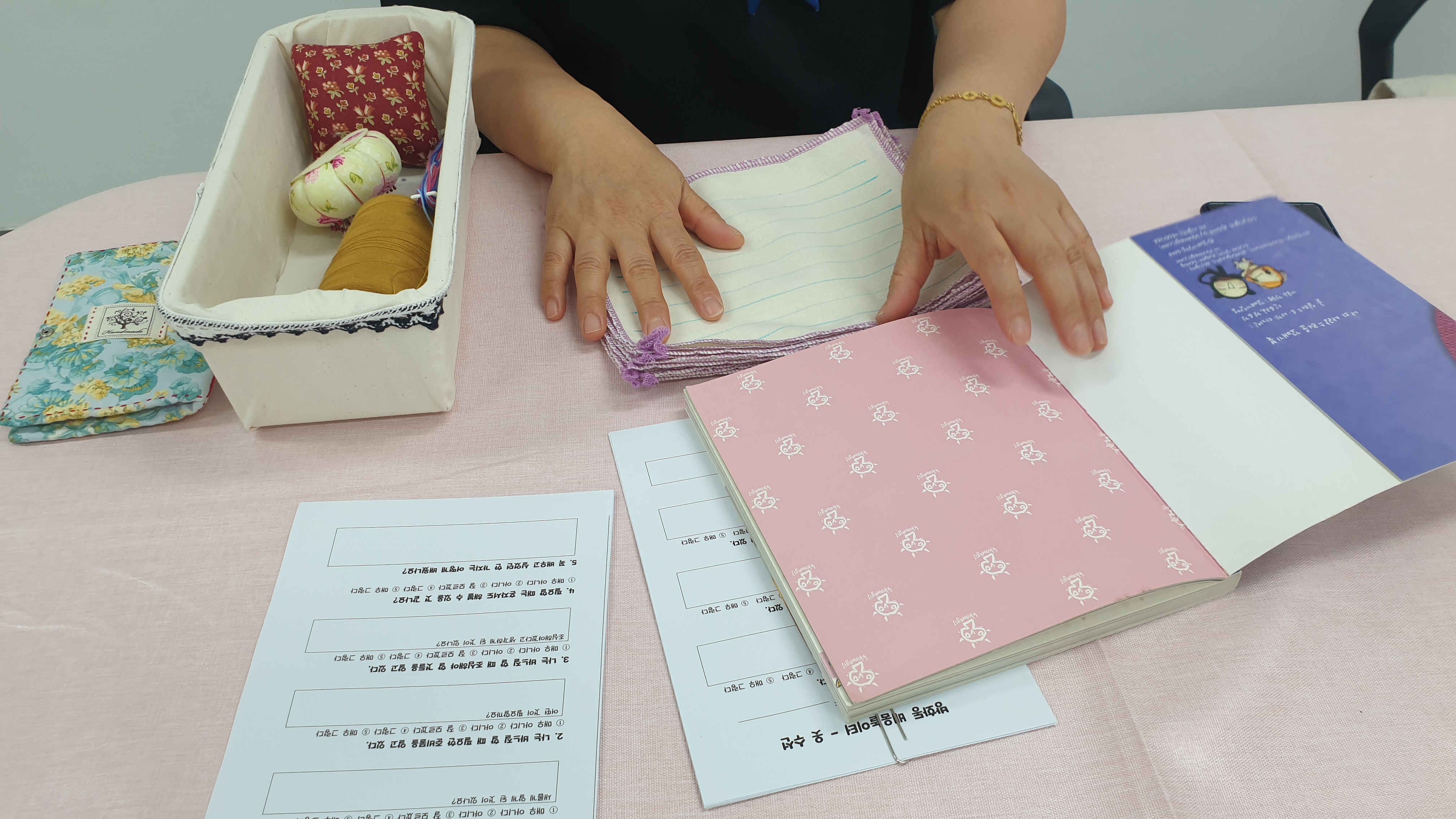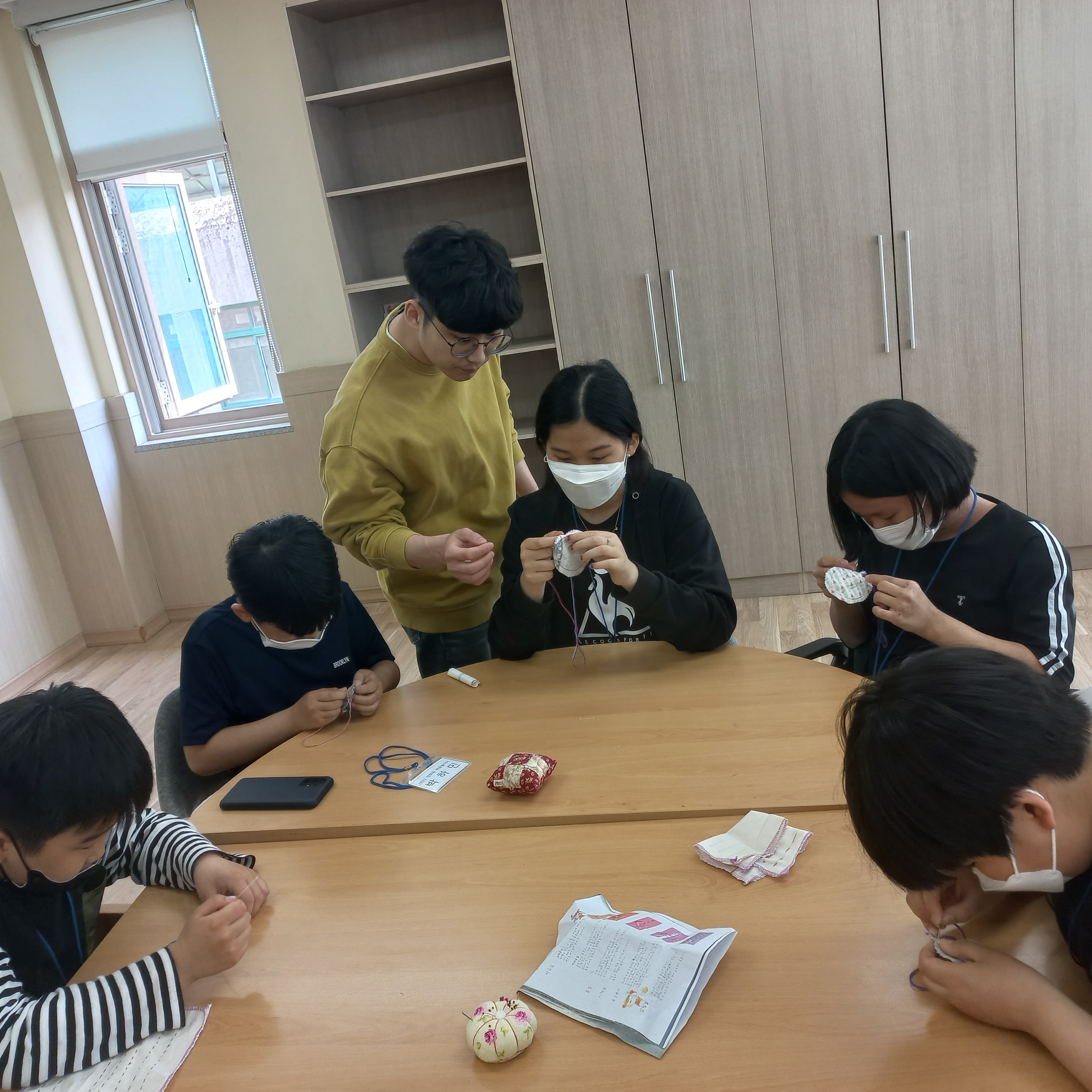 “그러면 선생님이 여러분이 간단한 바늘방석 만들어볼 수 있도록 재료를 가지고 올게요.”