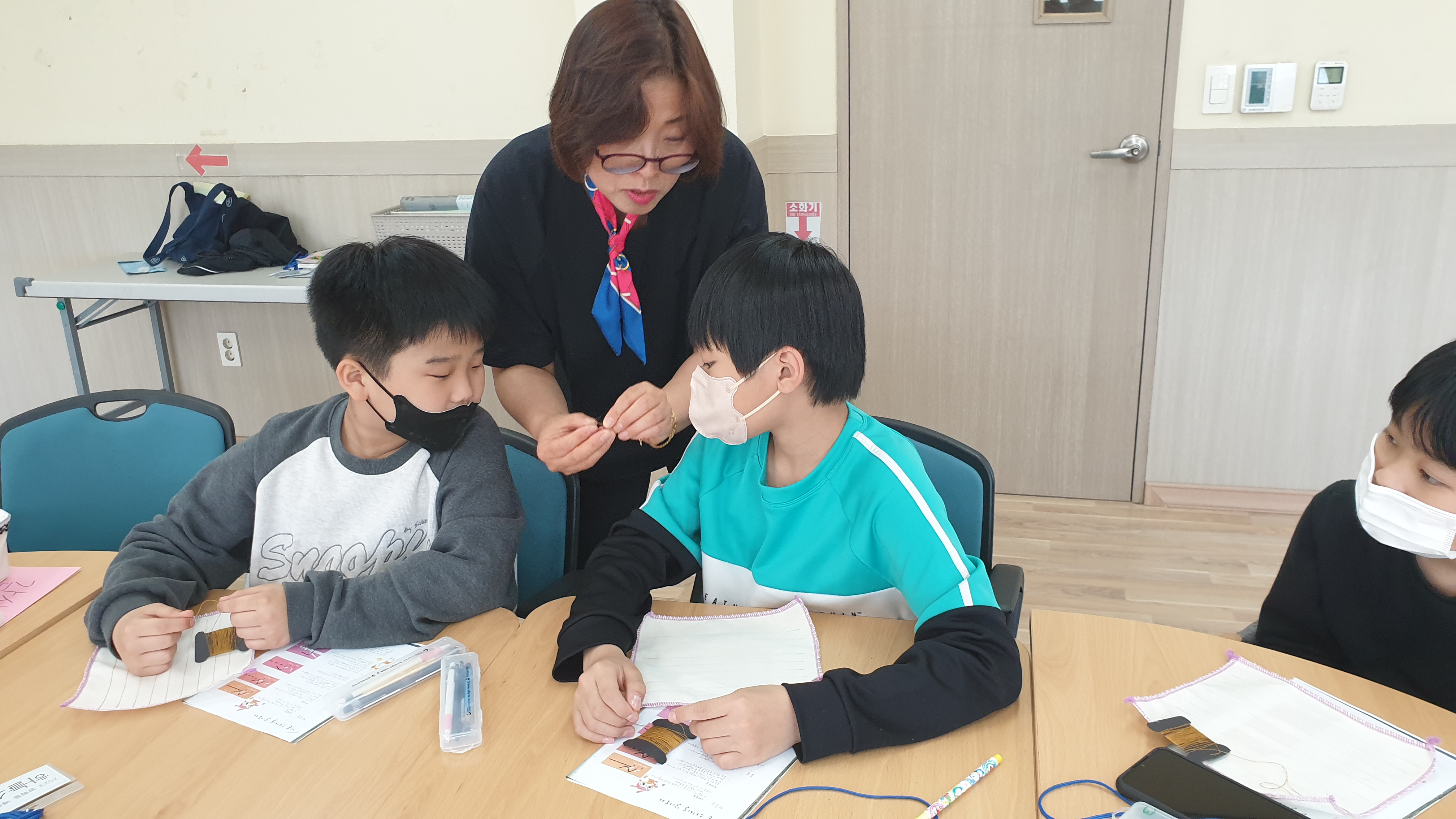 선생님은 아이들이 연습하는 모습을 보면서 아이들이 더 잘할 수 있도록 간격을 넓혀서 바느질하는 방법, 다 꿴 실을 마무리하는 방법 등을 가르쳐주셨습니다.