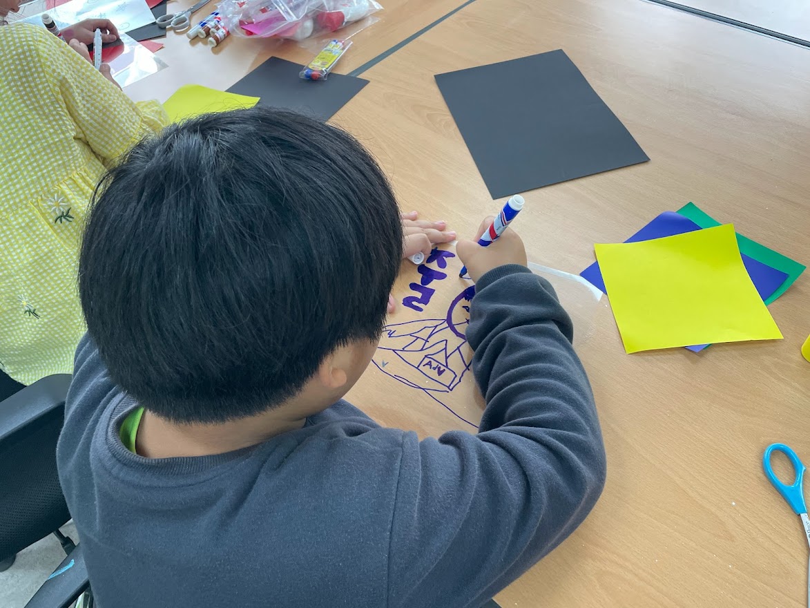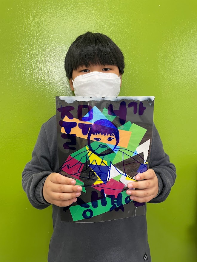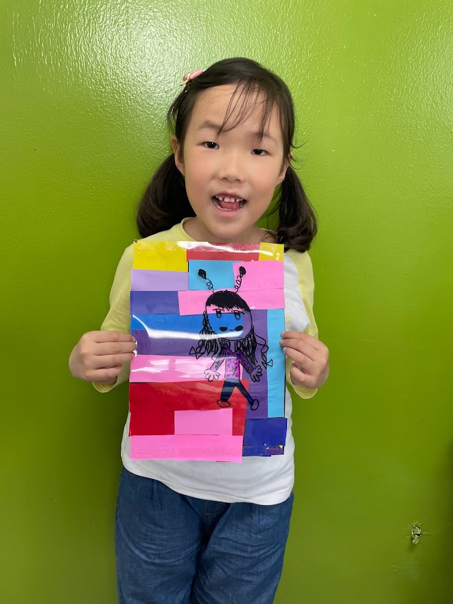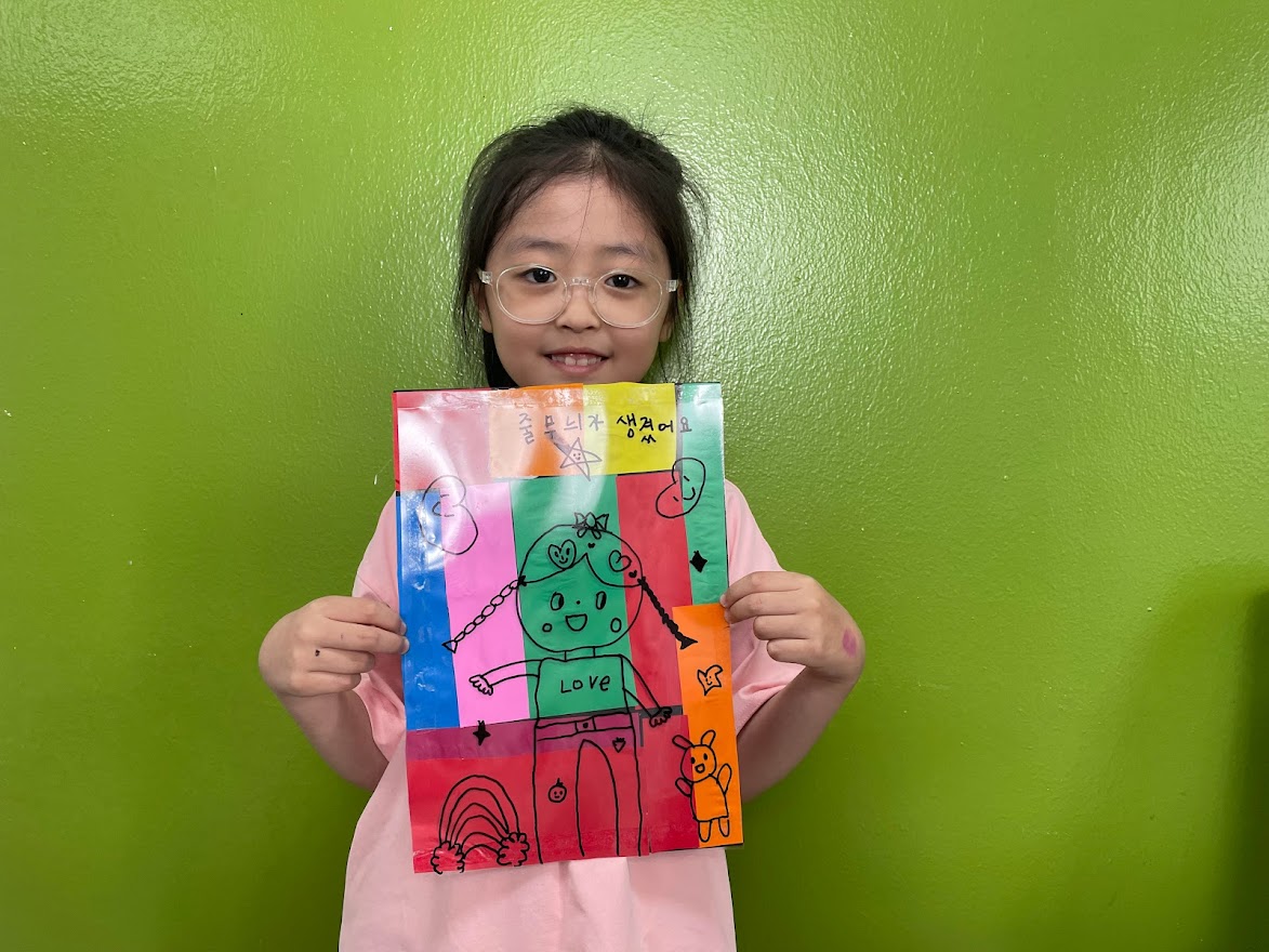 각자 그림을 그리고 색종이를 오리고 붙이기를 하다가 먼저 작품을 완성한 친구가