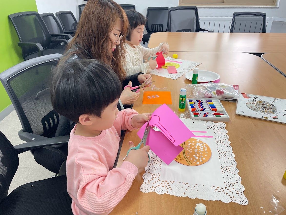 미술 선생님의 설명을 듣고 아이들이 고사리 같은 손으로 색종이를 자르고