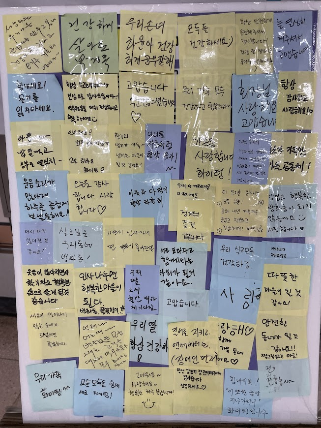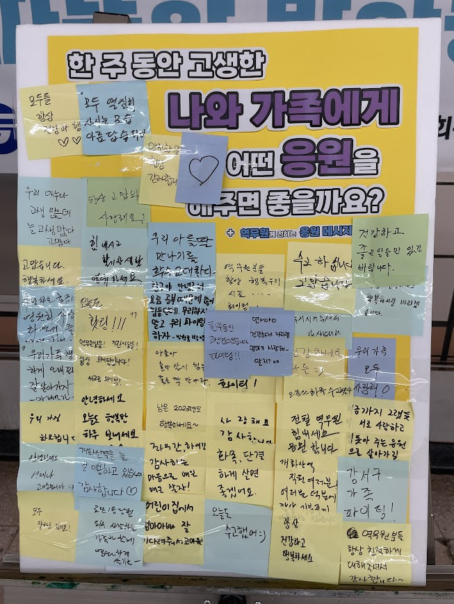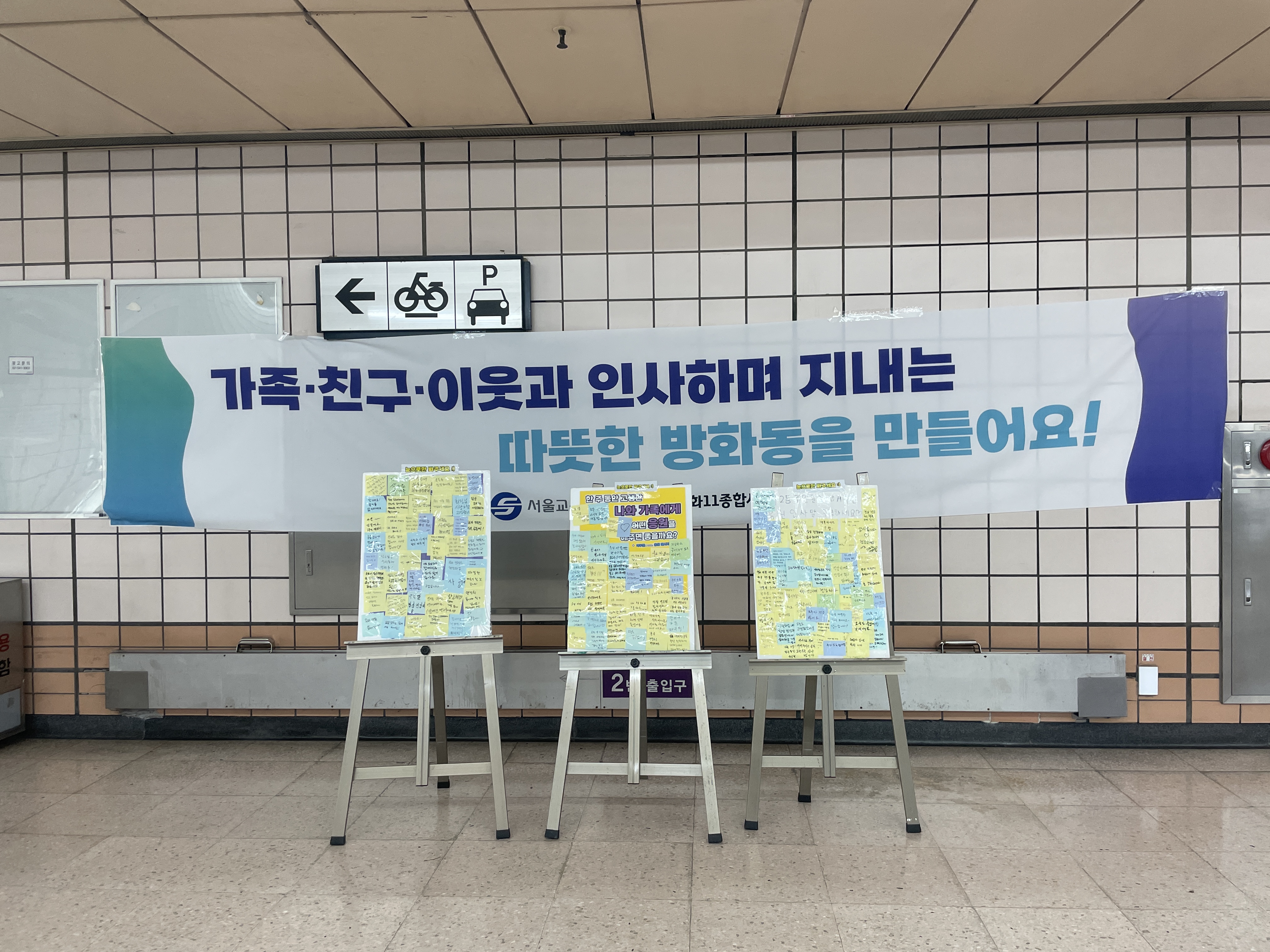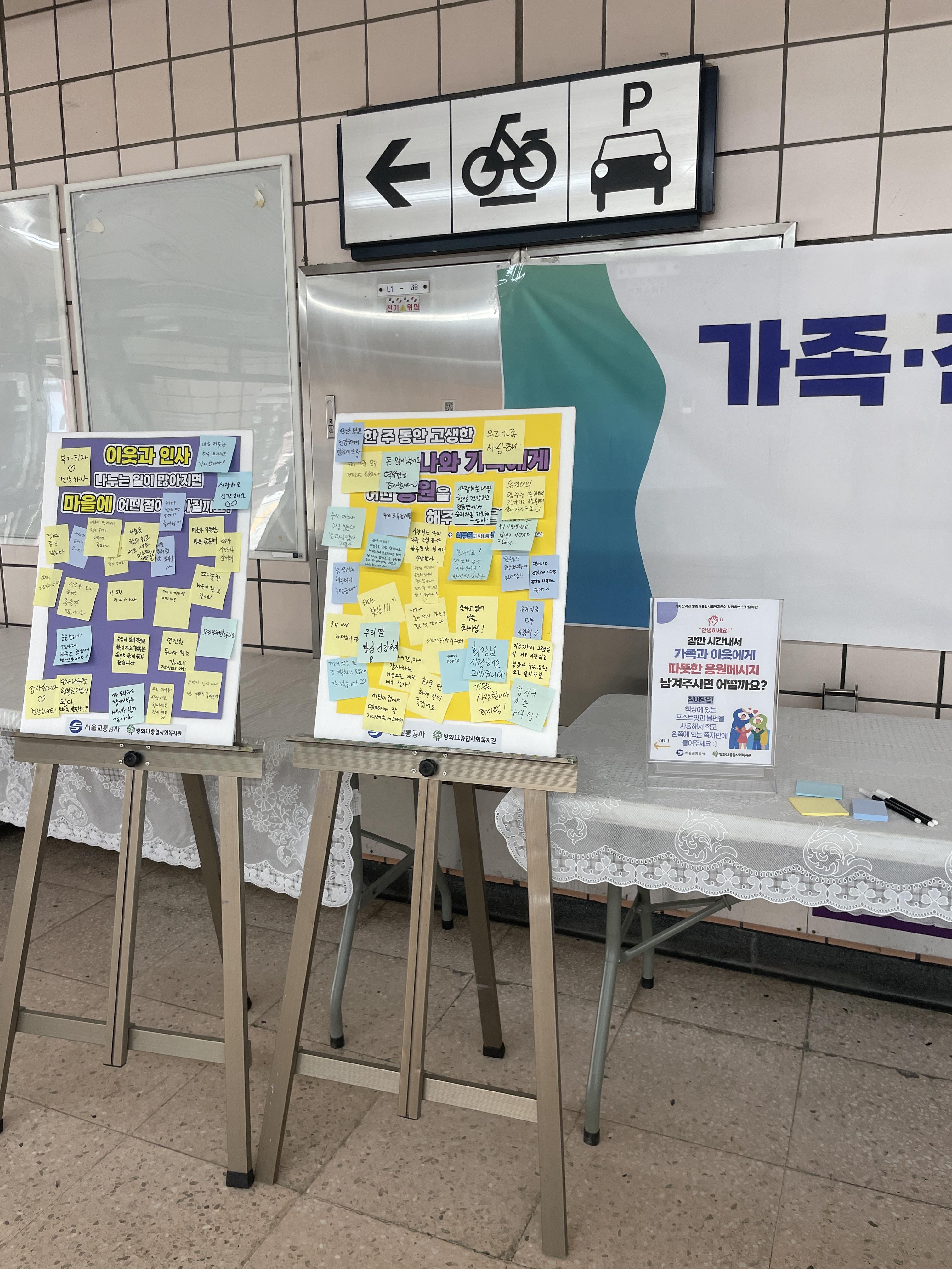 시간이 훌쩍 지나 어느새 인사캠페인을 종료할 시간이 되었습니다. 준비한 붙임쪽지판에 쪽지를 다 붙이고도 자리가 없을 정도로 많은 주민분들이 참여해주셨습니다. 캠페인은 끝났지만, 소중한 인사말들을 주민들과 함께 나누고 싶어 개화산역에 비치했습니다.